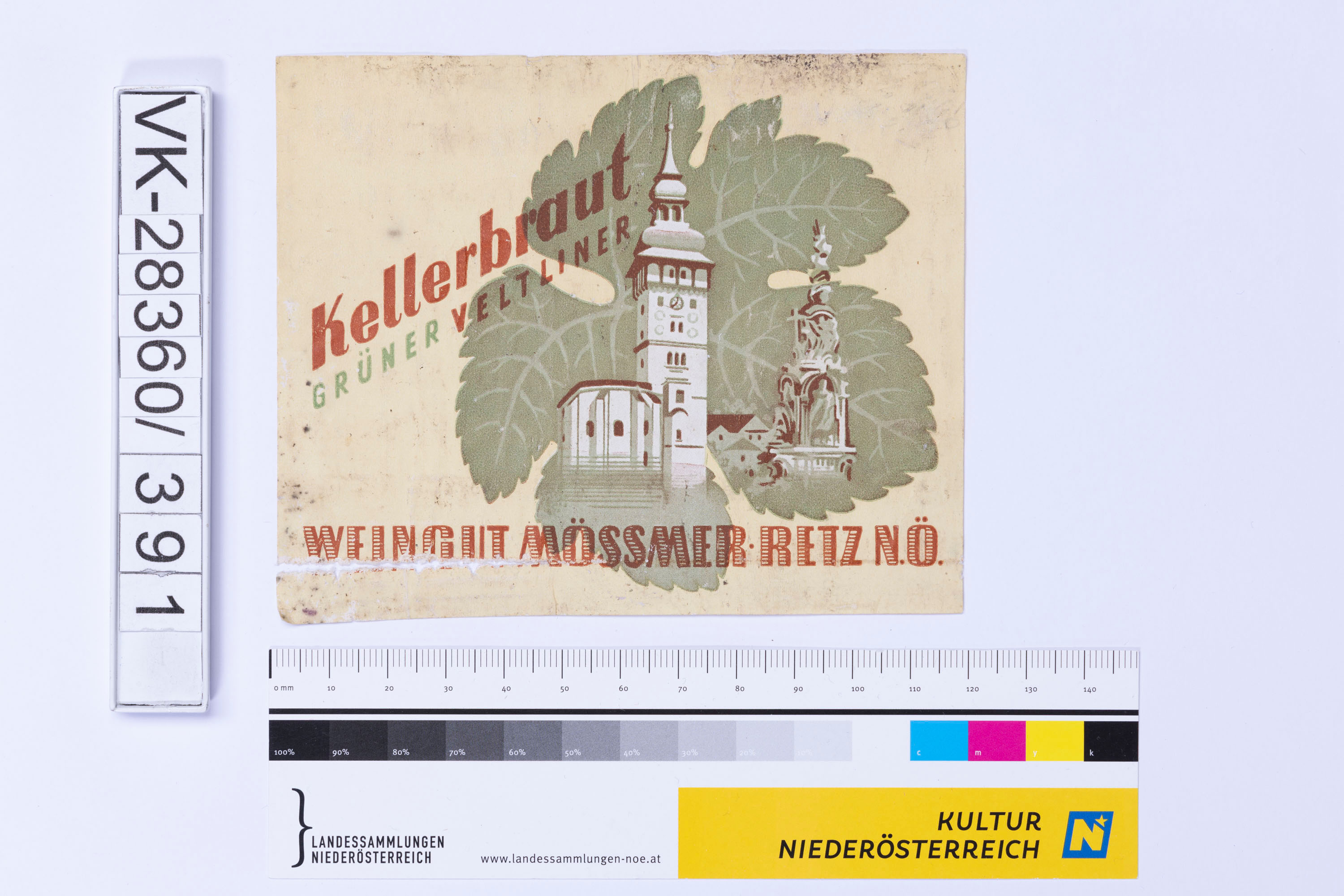Abgelöstes Weinflaschenetikett aus einer Sammlung von den 1940er bis zu den frühen 1960er Jahren; Weinsorte: "Kellerbraut GRÜNER VELTLINER", Kirchendarstellung mit Weinblatt; Weinbau, Kellerei bzw. Handel: "WEINGUT MÖSSMER RETZ N.Ö."