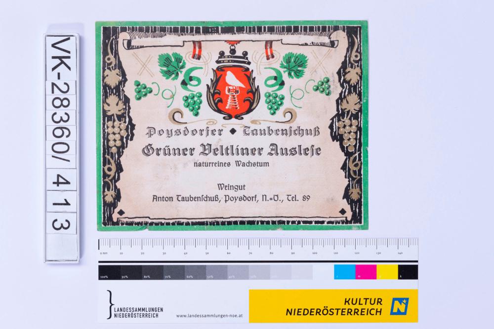 Abgelöstes Weinflaschenetikett aus einer Sammlung von den 1940er bis zu den frühen 1960er Jahren; Weinsorte: "Poysdorfer Taubenschuß Grüner Veltliner Auslese", Wappendarstellung mit Weinreben; Weinbau, Kellerei bzw. Handel: "Weingut Anton Taubenschuß, Poysdorf, N.=Ö., Tel. 89"