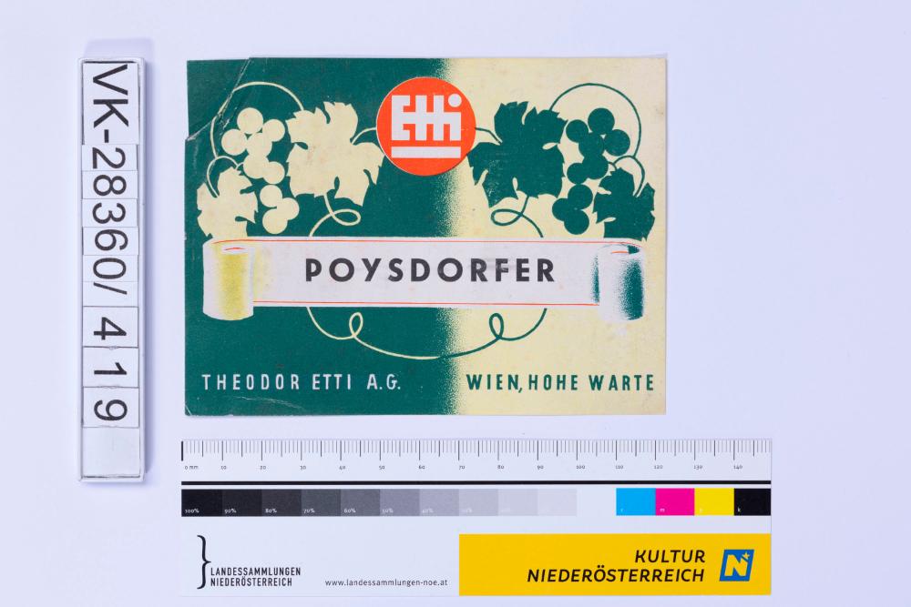 Abgelöstes Weinflaschenetikett aus einer Sammlung von den 1940er bis zu den frühen 1960er Jahren; Weinsorte: "POYSDORFER", Markenzeichen mit Weinreben; Weinbau, Kellerei bzw. Handel: "THEODOR ETTI A.G. WIEN, HOHE WARTE"