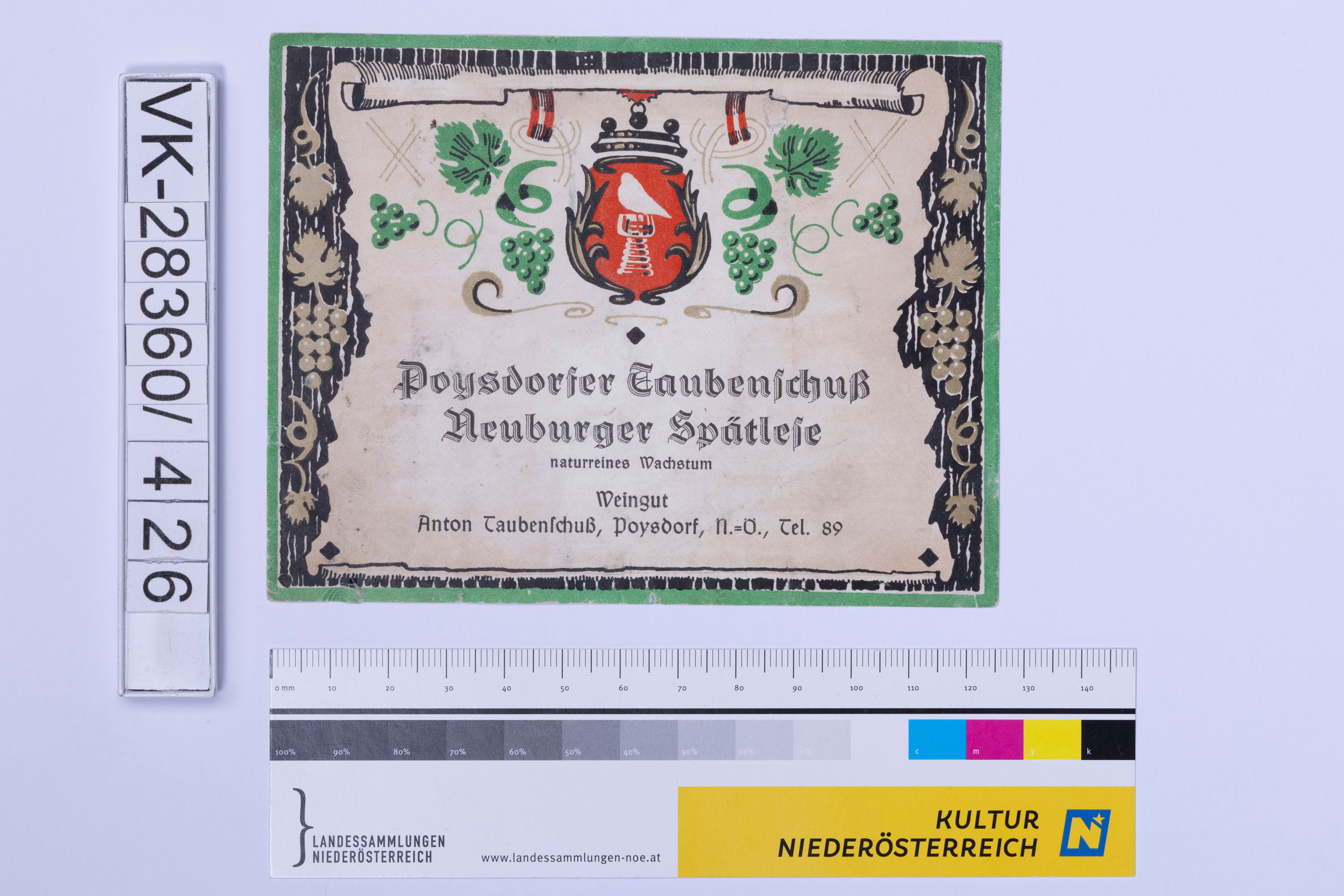 Abgelöstes Weinflaschenetikett aus einer Sammlung von den 1940er bis zu den frühen 1960er Jahren; Weinsorte: "Poysdorfer Taubenschuß Neuburger Spätlese", Wappendarstellung mit Weinreben; Weinbau, Kellerei bzw. Handel: "Weingut Anton Taubenschuß, Poysdorf, N.=Ö., Tel. 89"
