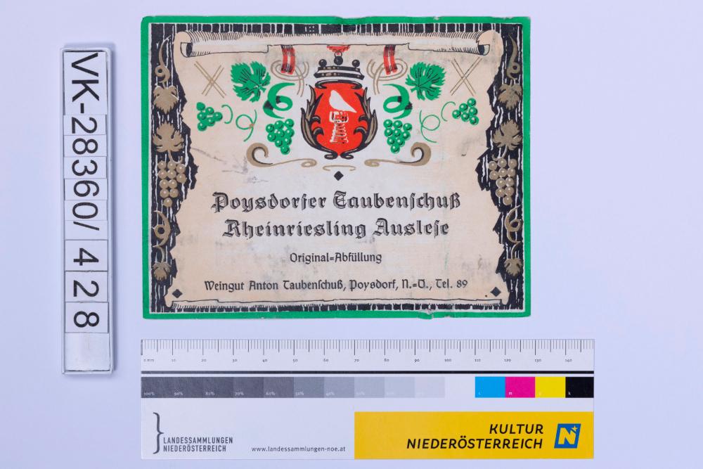 Abgelöstes Weinflaschenetikett aus einer Sammlung von den 1940er bis zu den frühen 1960er Jahren; Weinsorte: "Poysdorfer Taubenschuß Rheinriesling Auslese", Wappendarstellung mit Weinreben; Weinbau, Kellerei bzw. Handel: "Weingut Anton Taubenschuß, Poysdorf, N.=Ö., Tel. 89"