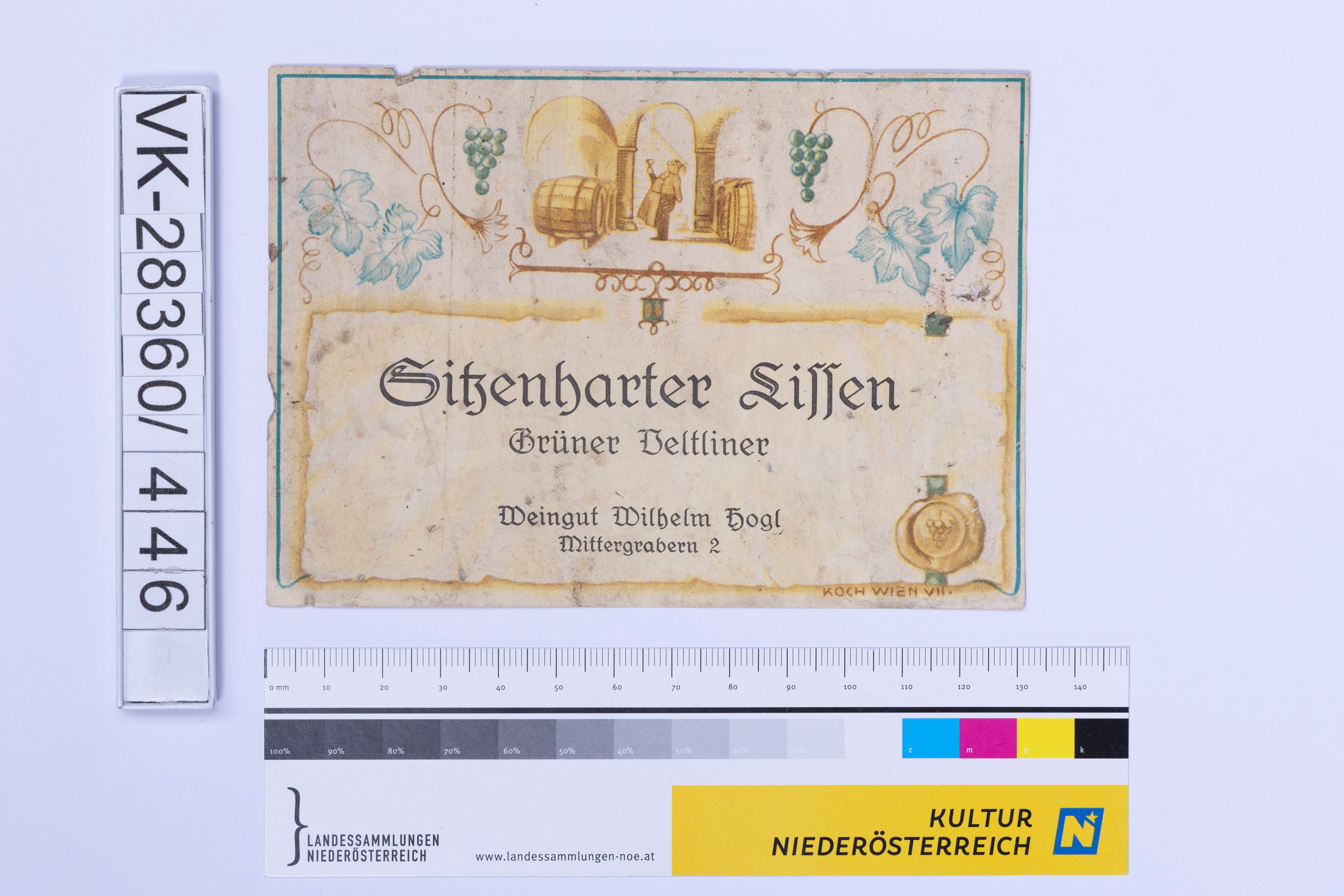 Abgelöstes Weinflaschenetikett aus einer Sammlung von den 1940er bis zu den frühen 1960er Jahren; Weinsorte: "Sitzenharter Lissen Grüner Veltliner", Darstellung von einem Weinkeller mit Mann und Weinreben; Weinbau, Kellerei bzw. Handel: "Weingut Wilhelm Hogl Wittergrabern 2"