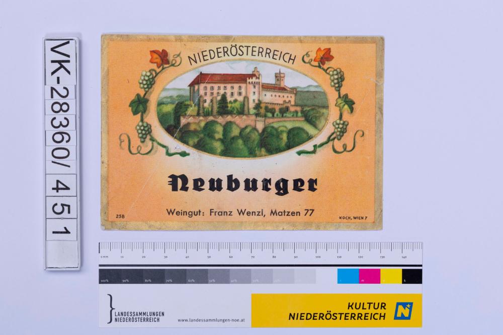 Abgelöstes Weinflaschenetikett aus einer Sammlung von den 1940er bis zu den frühen 1960er Jahren; Weinsorte: "Neuburg", Darstellung einer Burgtanlage; Weinbau, Kellerei bzw. Handel: "Weingut: Franz Wenzl, Matzen 77"