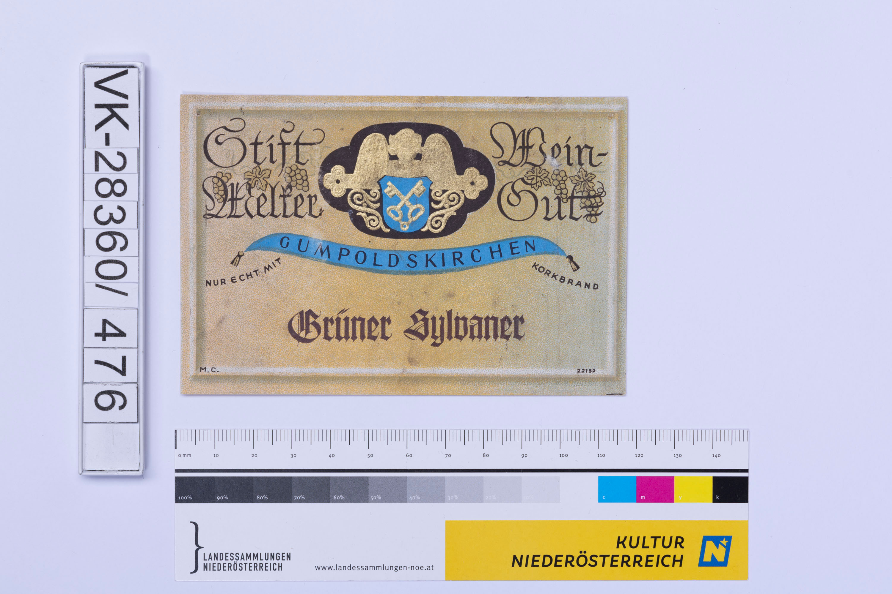 Abgelöstes Weinflaschenetikett aus einer Sammlung von den 1940er bis zu den frühen 1960er Jahren; Weinsorte: "Grüner Sylvaner", Wappendarstellung; Weinbau, Kellerei bzw. Handel: "Stift Melker Wein-Gut GUMPOLDSKIRCHEN"