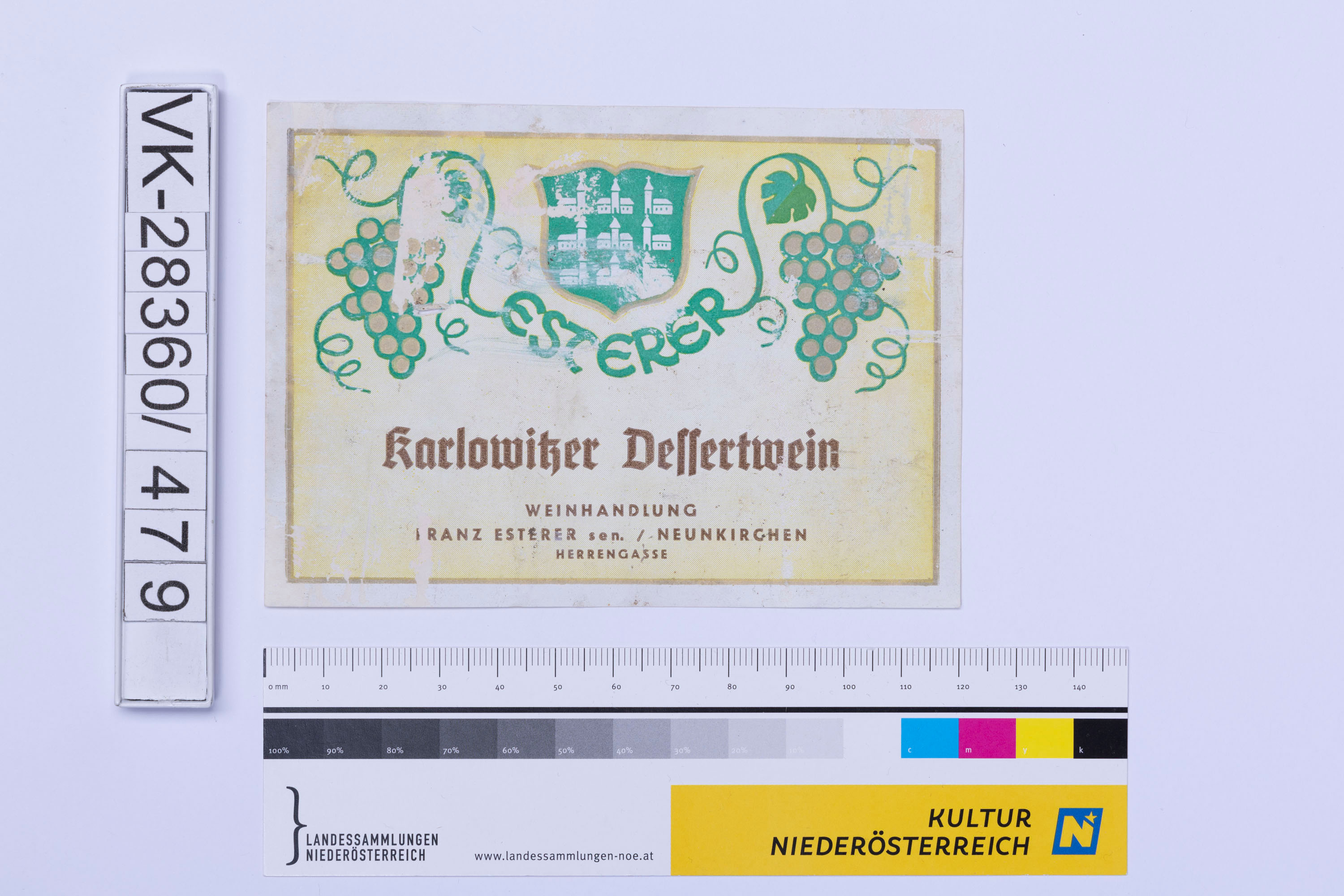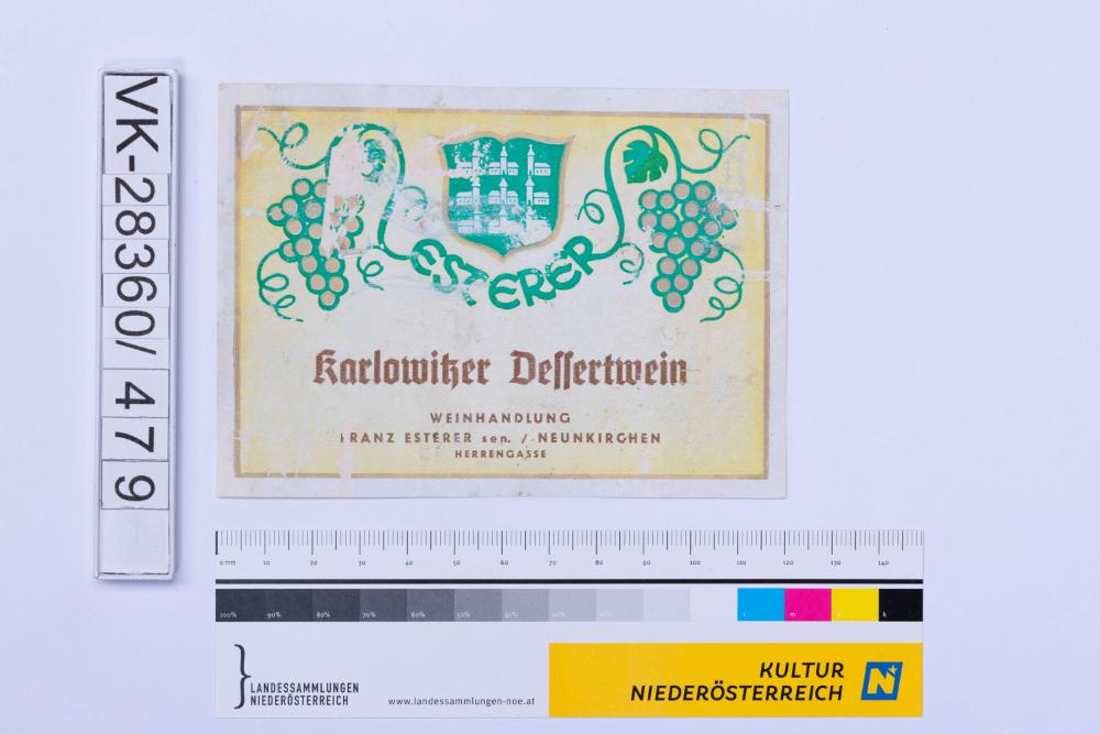 Abgelöstes Weinflaschenetikett aus einer Sammlung von den 1940er bis zu den frühen 1960er Jahren; Weinsorte: "Karlowitzer Dessertwein", Wappendarstellung mit Weinreben; Weinbau, Kellerei bzw. Handel: "WEINHANDLUNG FRANZ ESTERER sen./NEUNKIRCHEN HERRENGASSE"