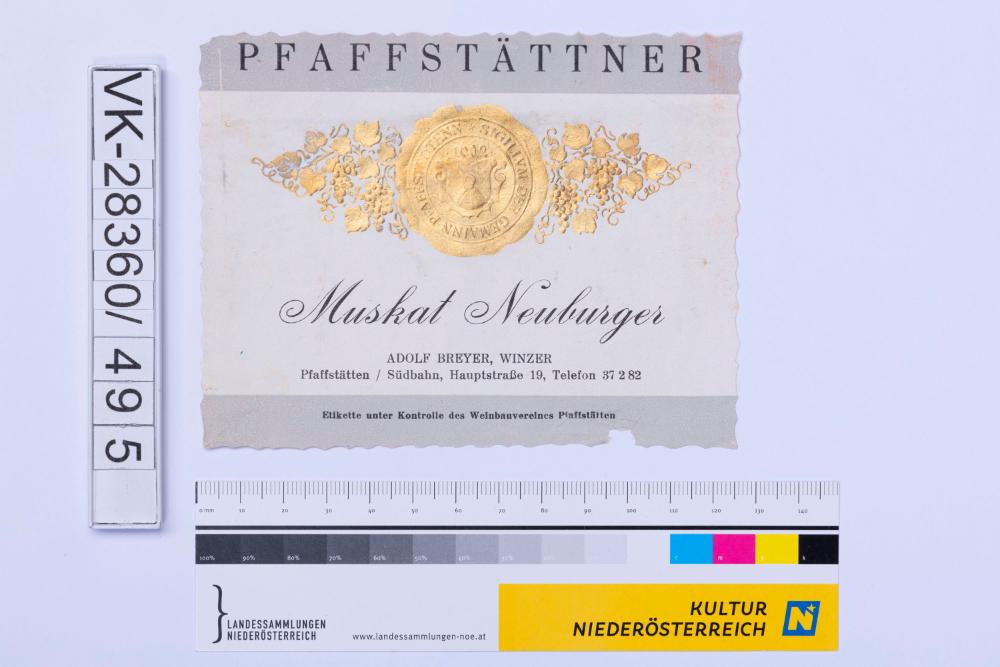 Abgelöstes Weinflaschenetikett aus einer Sammlung von den 1940er bis zu den frühen 1960er Jahren; Weinsorte: "PFAFFSTÄTTNER Muskat Neuburger", Wappendarstellung mit Weinreben; Weinbau, Kellerei bzw. Handel: "ADOLF BREYER, WINZER Pfaffstätten/Südbahn, Hauptstraße 19, Telefon 37282"
