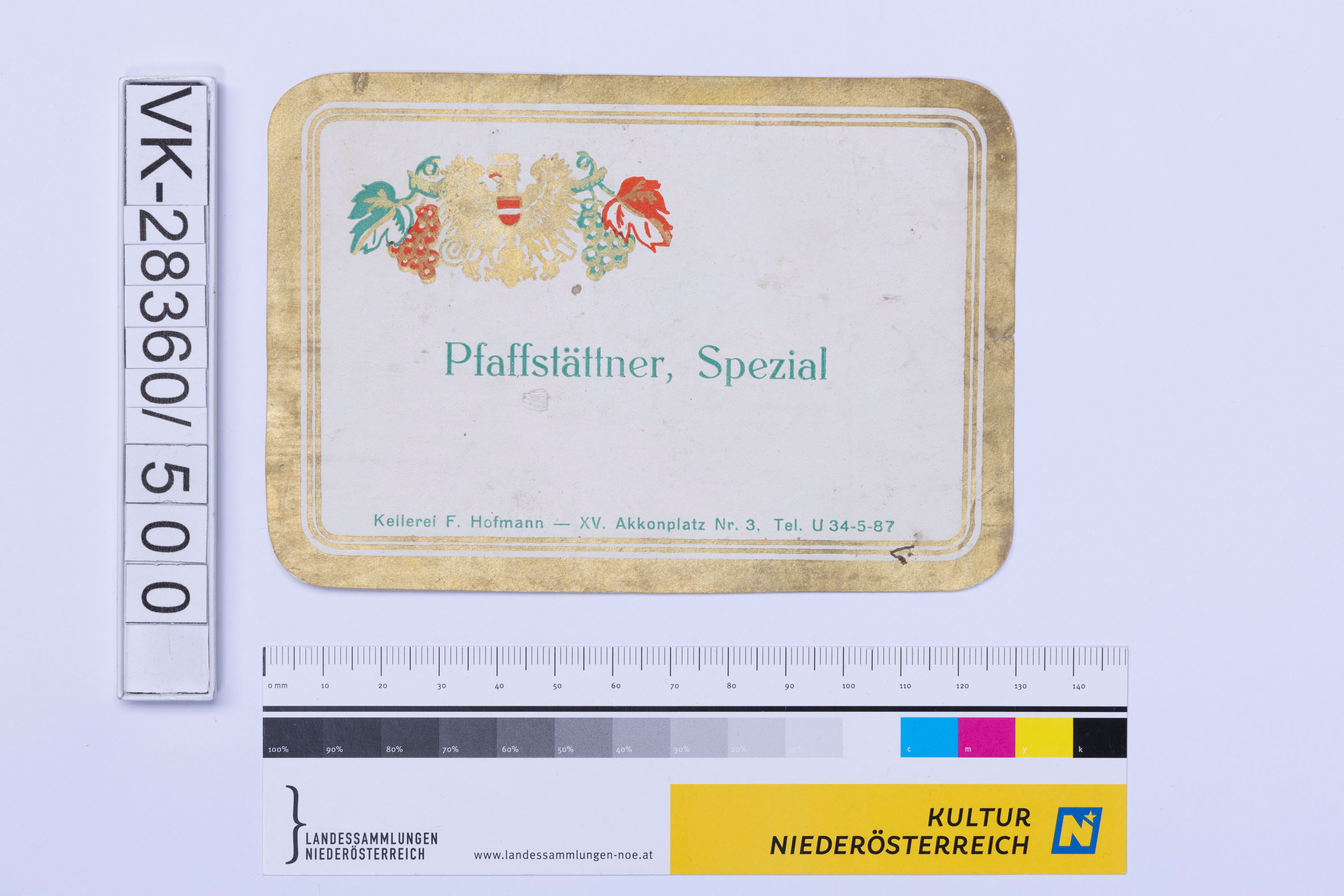 Abgelöstes Weinflaschenetikett aus einer Sammlung von den 1940er bis zu den frühen 1960er Jahren; Weinsorte: "Pfaffstättner Spezial", Wappenzeichen mit Weinreben; Weinbau, Kellerei bzw. Handel: "Kellerei F. Hofmann - XV. Akkonplatz Nr. 3, Tel. U34-5-87"