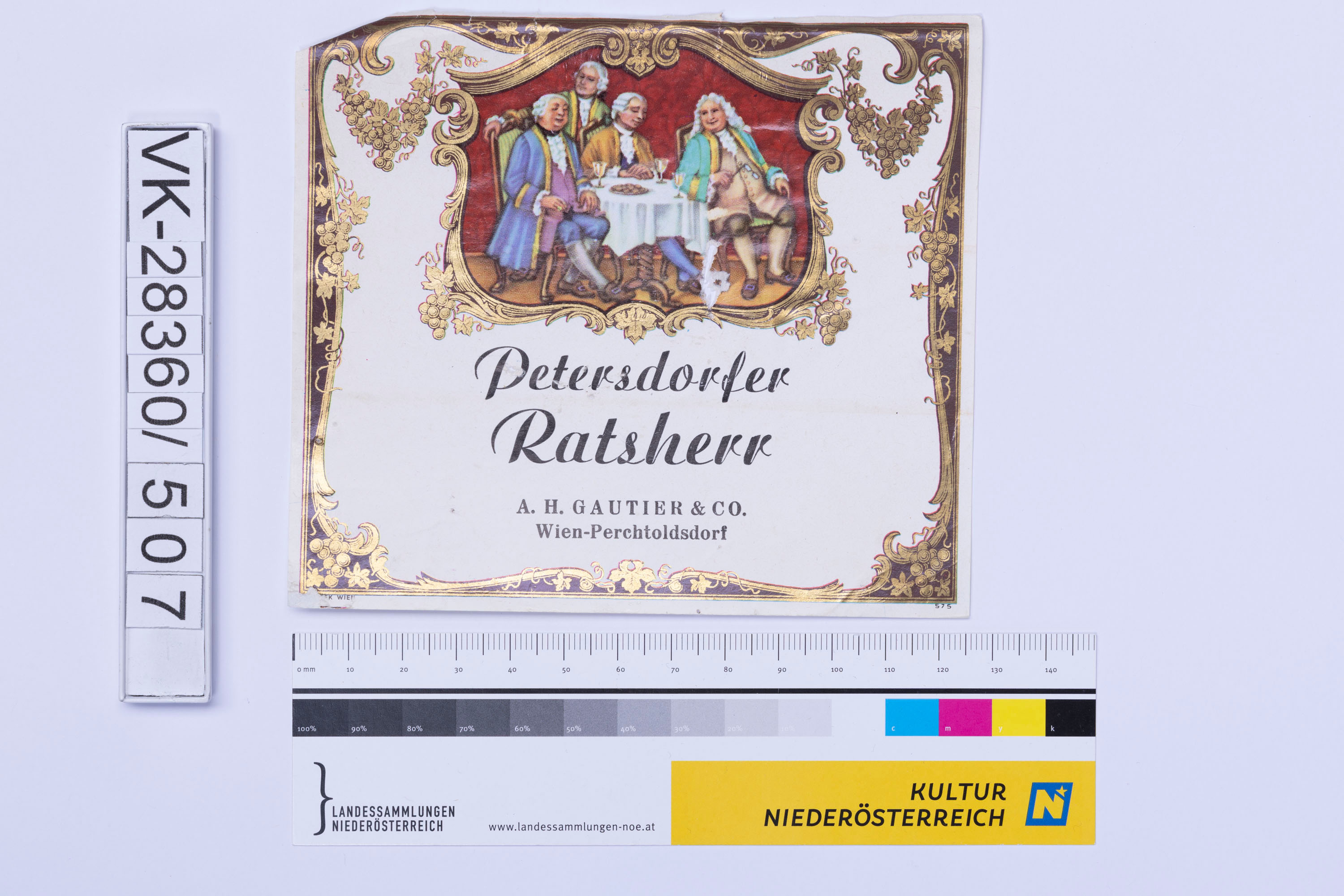 Abgelöstes Weinflaschenetikett aus einer Sammlung von den 1940er bis zu den frühen 1960er Jahren; Weinsorte: "Petersdorfer Ratsherr", Darstellung von Männern beim Wein trinken"; Weinbau, Kellerei bzw. Handel: "A.H. GAUTIER & CO. Wien-Perchtoldsorf"