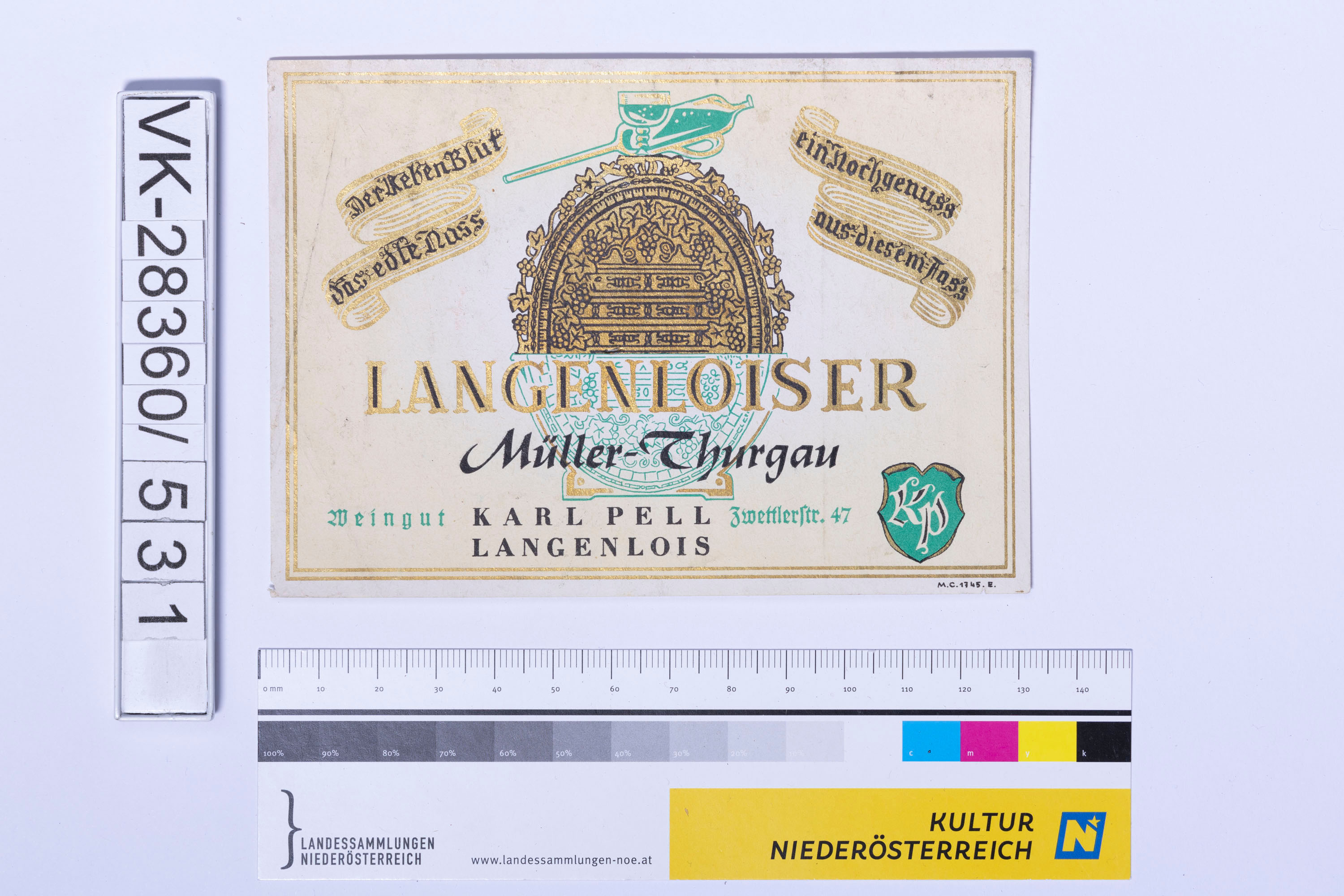 Abgelöstes Weinflaschenetikett aus einer Sammlung von den 1940er bis zu den frühen 1960er Jahren; Weinsorte: "LANGENLOISER Müller-Thurgau", Weinfass mit Weinglas und Reim "Der Reben Blut ein Hochgenuss das edle Nass aus diesem Fass"; Weinbau, Kellerei bzw. Handel: "Weingut KARL PELL Zwettlerstr. 47 LANGENLOIS"