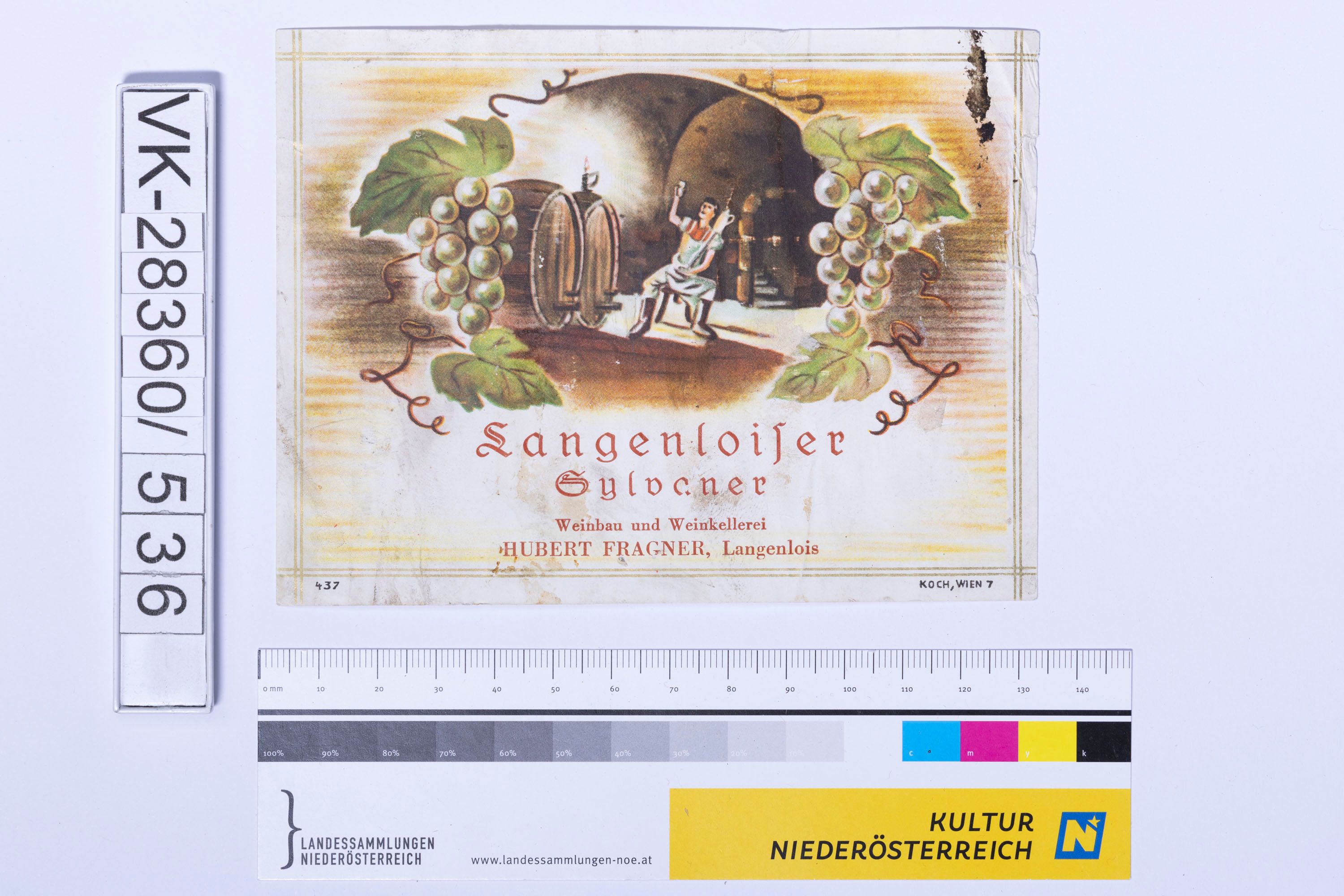 Abgelöstes Weinflaschenetikett aus einer Sammlung von den 1940er bis zu den frühen 1960er Jahren; Weinsorte: "Langenloiser Sylvaner", Darstellung von einem Mann in einem Weinkeller mit Weinreben; Weinbau, Kellerei bzw. Handel: "Weinbau und Weinkellerei HUBERT FRAGNER, Langenlois"