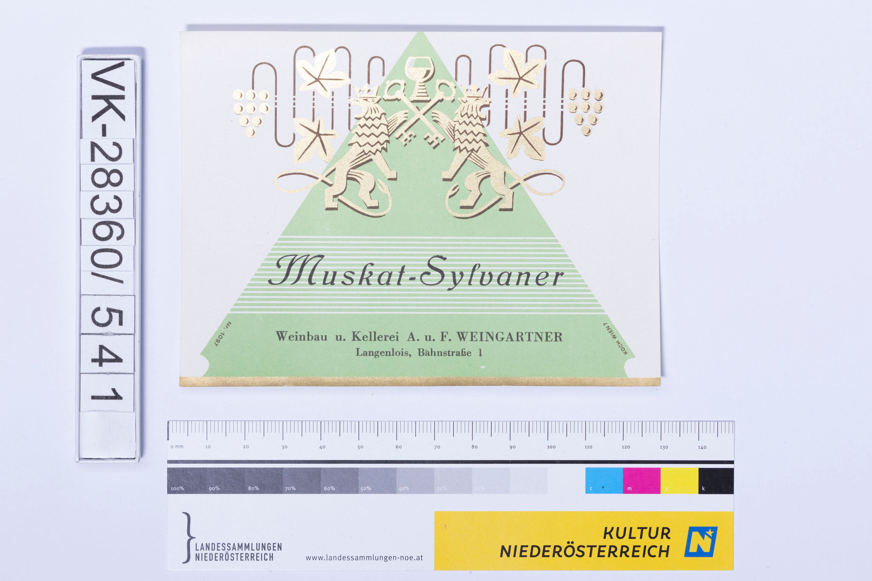Abgelöstes Weinflaschenetikett aus einer Sammlung von den 1940er bis zu den frühen 1960er Jahren; Weinsorte: "Muskat-Sylvaner", Darstellung von zwei Löwen mit Weinglas und -reben; Weinbau, Kellerei bzw. Handel: "Weinbau u. Kellerei A. u: F. WEINGARTNER Langenlois, Bahnstraße 1"
