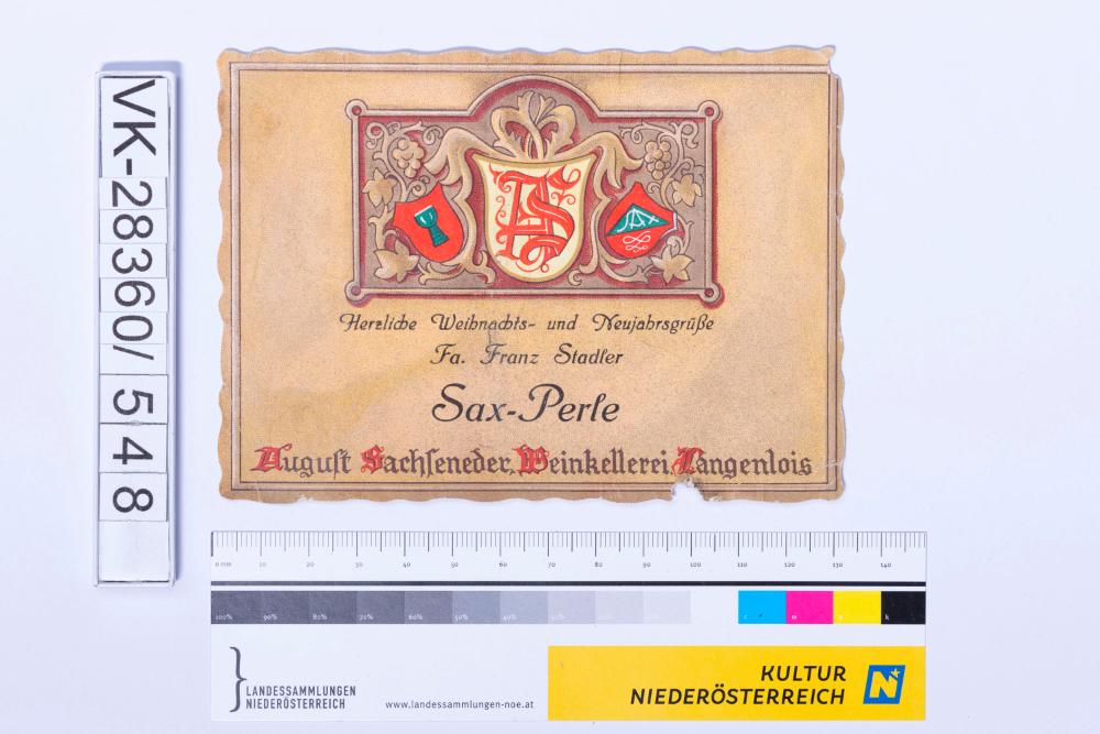 Abgelöstes Weinflaschenetikett aus einer Sammlung von den 1940er bis zu den frühen 1960er Jahren; Weinsorte: "Sax-Perle", Wappendarstellung und Grüße "Herzliche Weihnachts- und Neujahrsgrüße Fa. Franz Stadler"; Weinbau, Kellerei bzw. Handel: "August Sachseneder, Weinkellerei Langenlois"