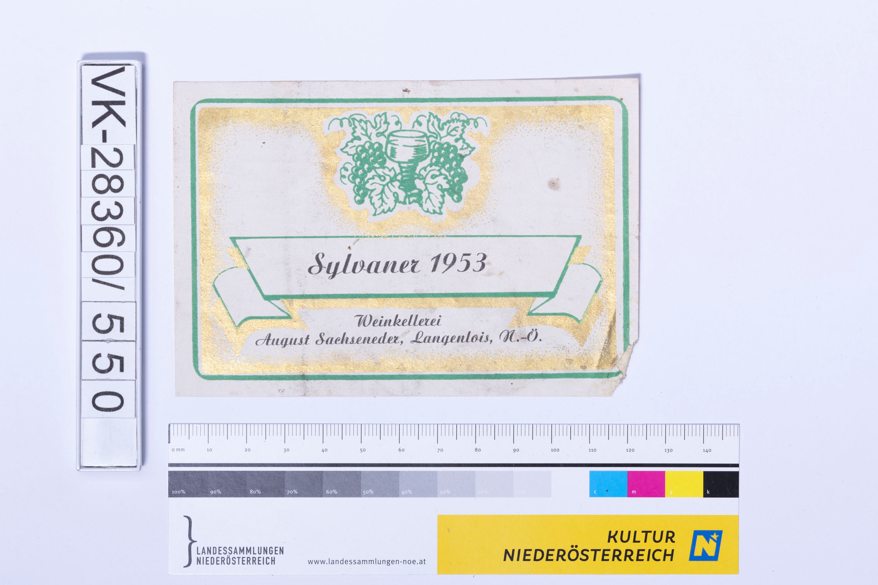 Abgelöstes Weinflaschenetikett aus einer Sammlung von den 1940er bis zu den frühen 1960er Jahren; Weinsorte: "Sylvaner 1953", Weinglas und Reben; Weinbau, Kellerei bzw. Handel: "Weinkellerei August Sachseneder, Langenlois, N.-Ö."