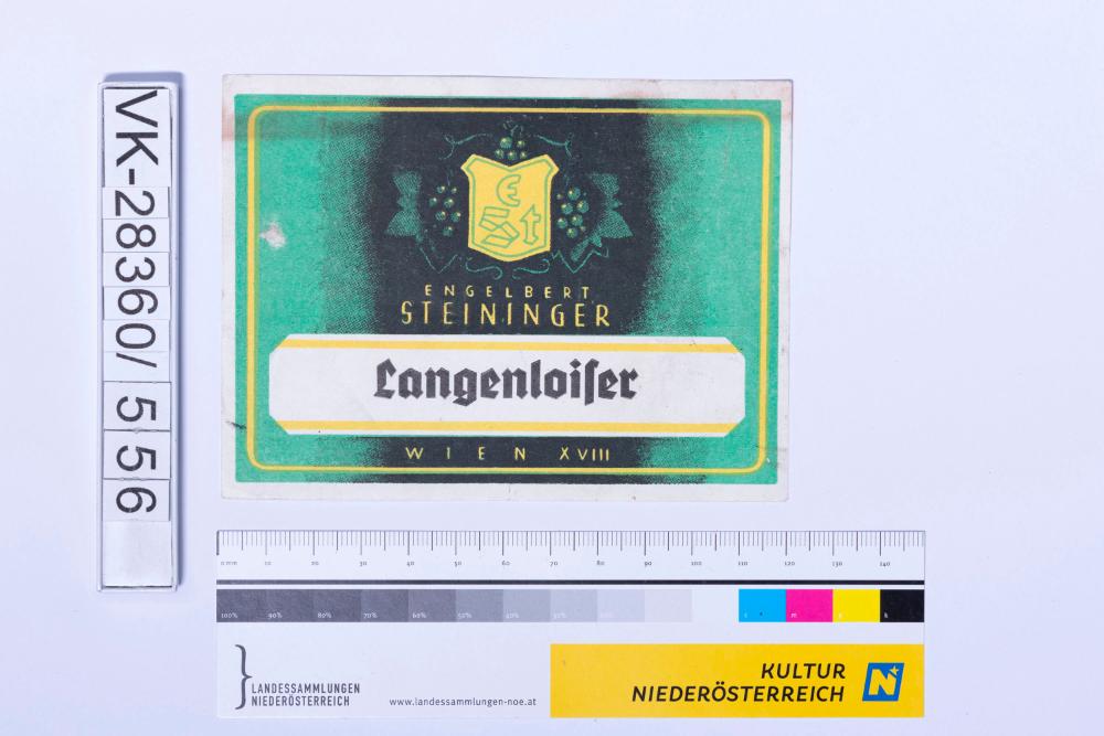 Abgelöstes Weinflaschenetikett aus einer Sammlung von den 1940er bis zu den frühen 1960er Jahren; Weinsorte: "Langenloiser", Markenzeichen; Weinbau, Kellerei bzw. Handel: "ENGELBERT STEININGER WIEN XVIII"