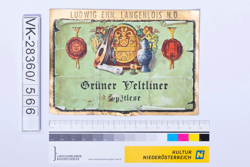 Abgelöstes Weinflaschenetikett aus einer Sammlung von den 1940er bis zu den frühen 1960er Jahren; Weinsorte: "Grüner Veltliner Spätlese", Darstellung von einem Weinfass, -glas und -krug mit Weinreben und Siegel; Weinbau, Kellerei bzw. Handel: "LUDWIG EHN, LANGENLOIS N.Ö."
