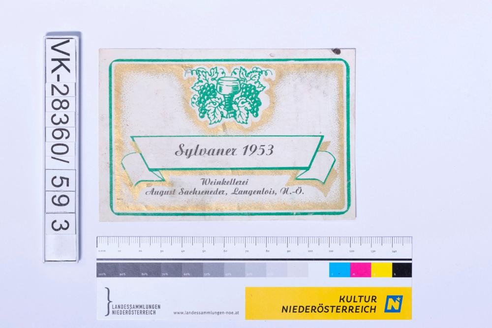 Abgelöstes Weinflaschenetikett aus einer Sammlung von den 1940er bis zu den frühen 1960er Jahren; Weinsorte: "Sylvaner 1953", Darstellung von Weinglas und Weinreben; Weinbau, Kellerei bzw. Handel: "Weinkellerei August Sachseneder, Langenlois, N.-Ö."
