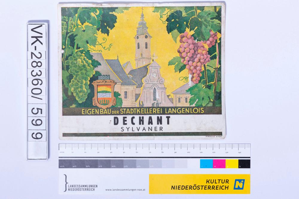 Abgelöstes Weinflaschenetikett aus einer Sammlung von den 1940er bis zu den frühen 1960er Jahren; Weinsorte: "DECHANT SYLVANER", Kirchenansicht mit Weinreben und Wappendarstellung; Weinbau, Kellerei bzw. Handel: "EIGENBAU DER STADTKELLEREI LANGENLOIS"