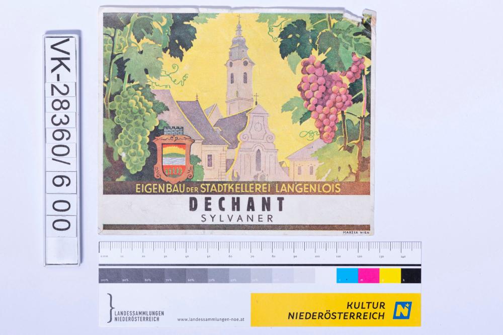 Abgelöstes Weinflaschenetikett aus einer Sammlung von den 1940er bis zu den frühen 1960er Jahren; Weinsorte: "DECHANT SYLVANER", Kirchenansicht mit Weinreben und Wappendarstellung; Weinbau, Kellerei bzw. Handel: "EIGENBAU DER STADTKELLEREI LANGENLOIS"