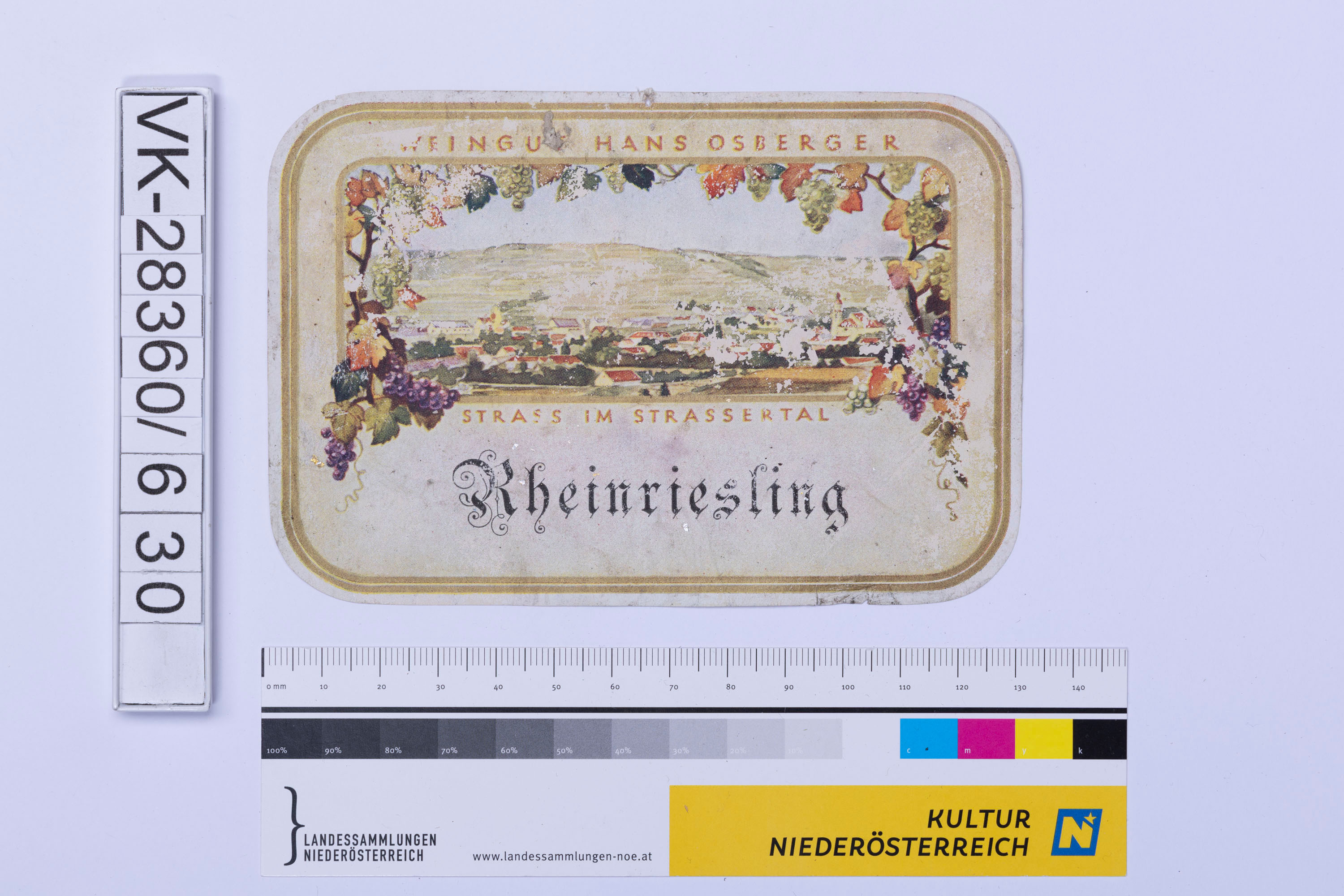Abgelöstes Weinflaschenetikett aus einer Sammlung von den 1940er bis zu den frühen 1960er Jahren; Weinsorte: "Rheinriesling", Stadtansicht und Weinberge; Weinbau, Kellerei bzw. Handel: "WEINGUT HANS OSBERGER STRASS IM STRASSERTAL"