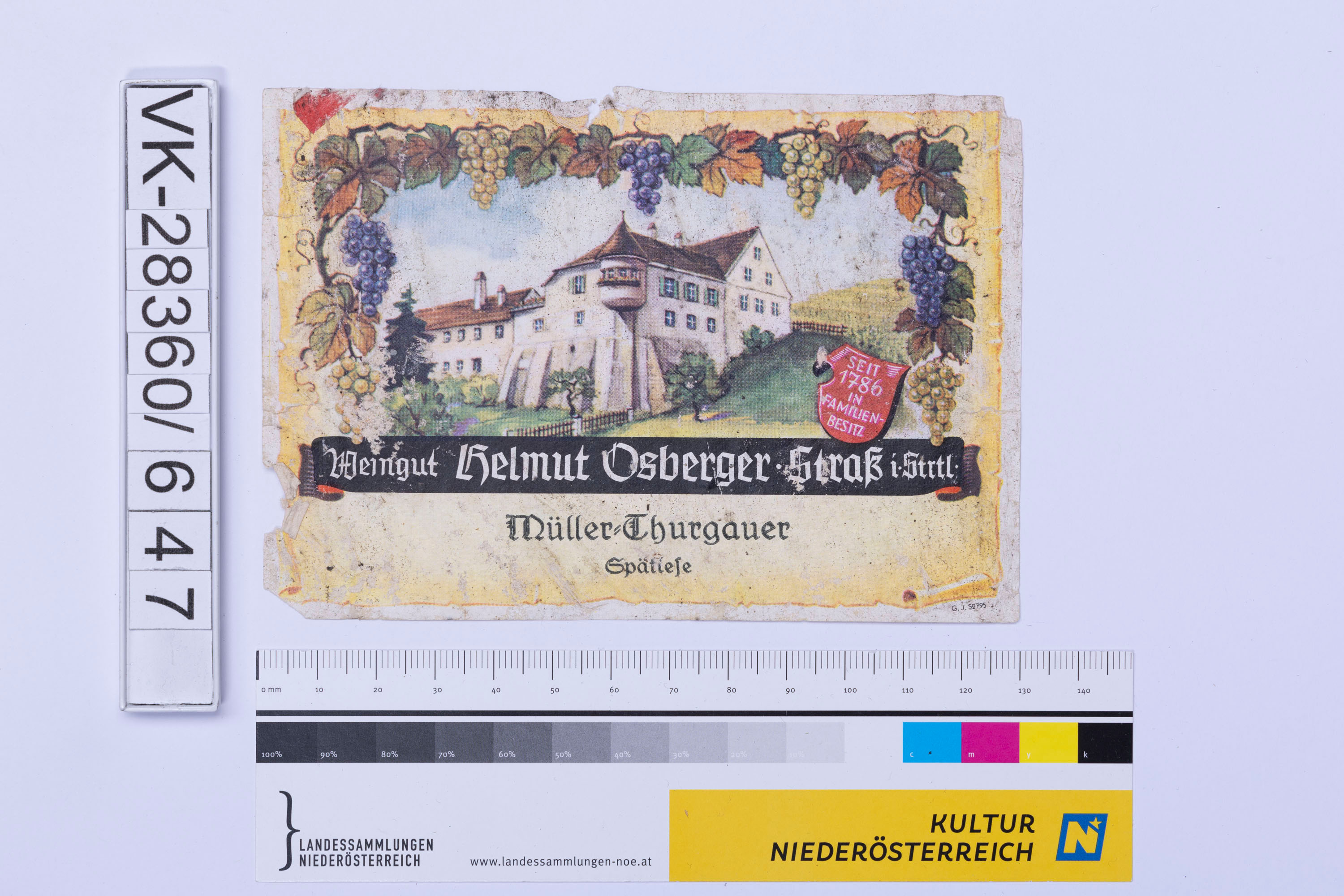 Abgelöstes Weinflaschenetikett aus einer Sammlung von den 1940er bis zu den frühen 1960er Jahren; Weinsorte: "Müller=Thurgauer", Darstellung eines Weingutes; Weinbau, Kellerei bzw. Handel: "Weingut Helmut Osberger Straß i. Strtl"