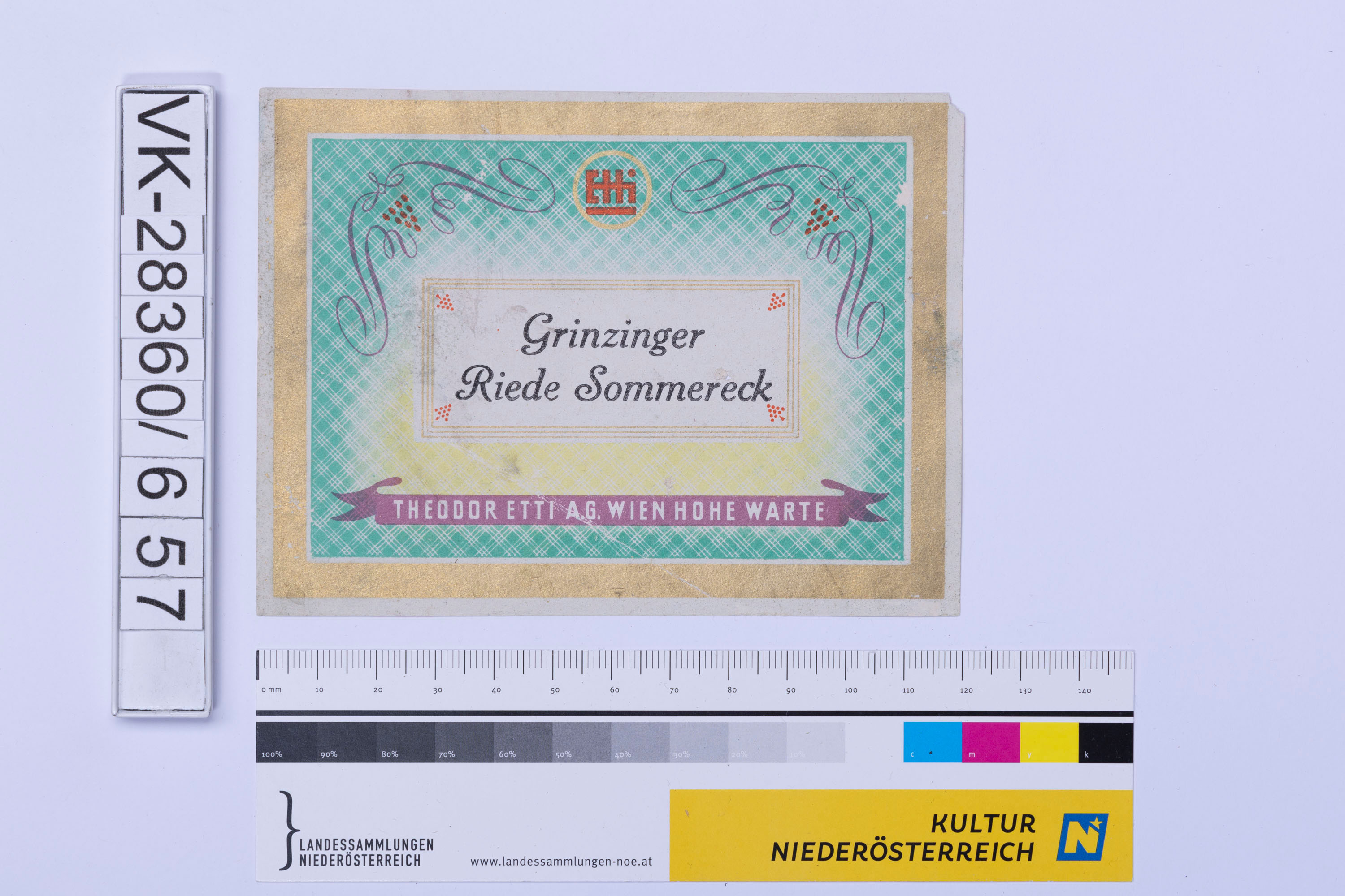 Abgelöstes Weinflaschenetikett aus einer Sammlung von den 1940er bis zu den frühen 1960er Jahren; Weinsorte: "Grinzinger Riede Sommereck", Markenzeichen; Weinbau, Kellerei bzw. Handel: "THEODORETTI A.G. WIEN HOHE WARTE"
