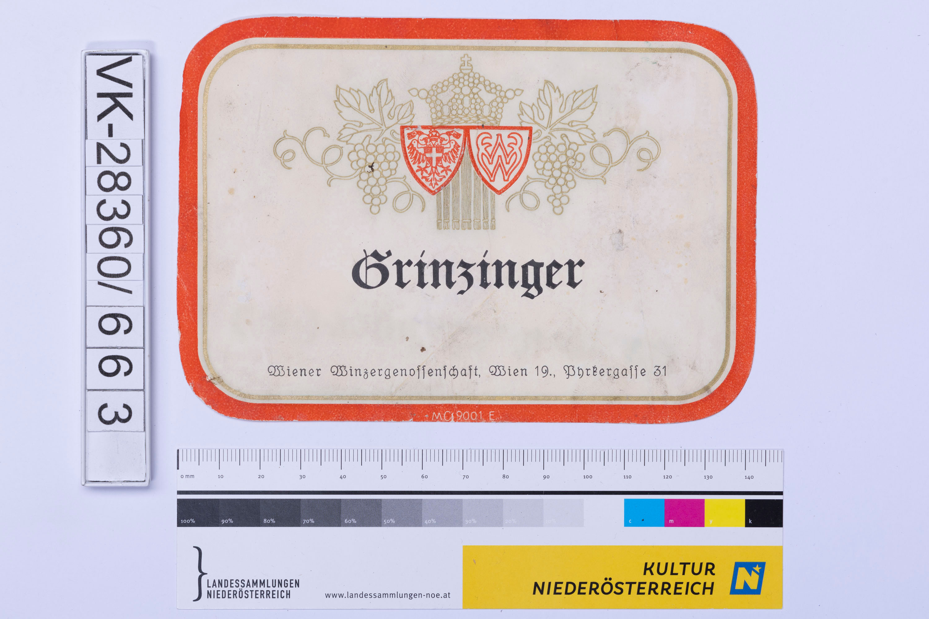 Abgelöstes Weinflaschenetikett aus einer Sammlung von den 1940er bis zu den frühen 1960er Jahren; Weinsorte: "Grinzinger", Wappendarstellung mit Krone und Weinreben; Weinbau, Kellerei bzw. Handel: "Wiener Winzergenossenschaft, Wien 19. Pyrkergasse 31"