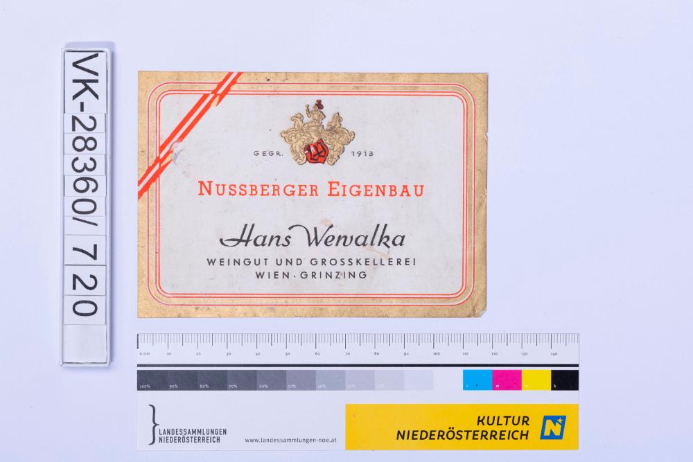 Abgelöstes Weinflaschenetikett aus einer Sammlung von den 1940er bis zu den frühen 1960er Jahren; Weinsorte: "NUSSBERGER EIGENBAU", Wappendarstellung; Weinbau, Kellerei bzw. Handel: Hans Wewalka WEINGUT UND GROSSKELLEREI WIEN GRIENZING"