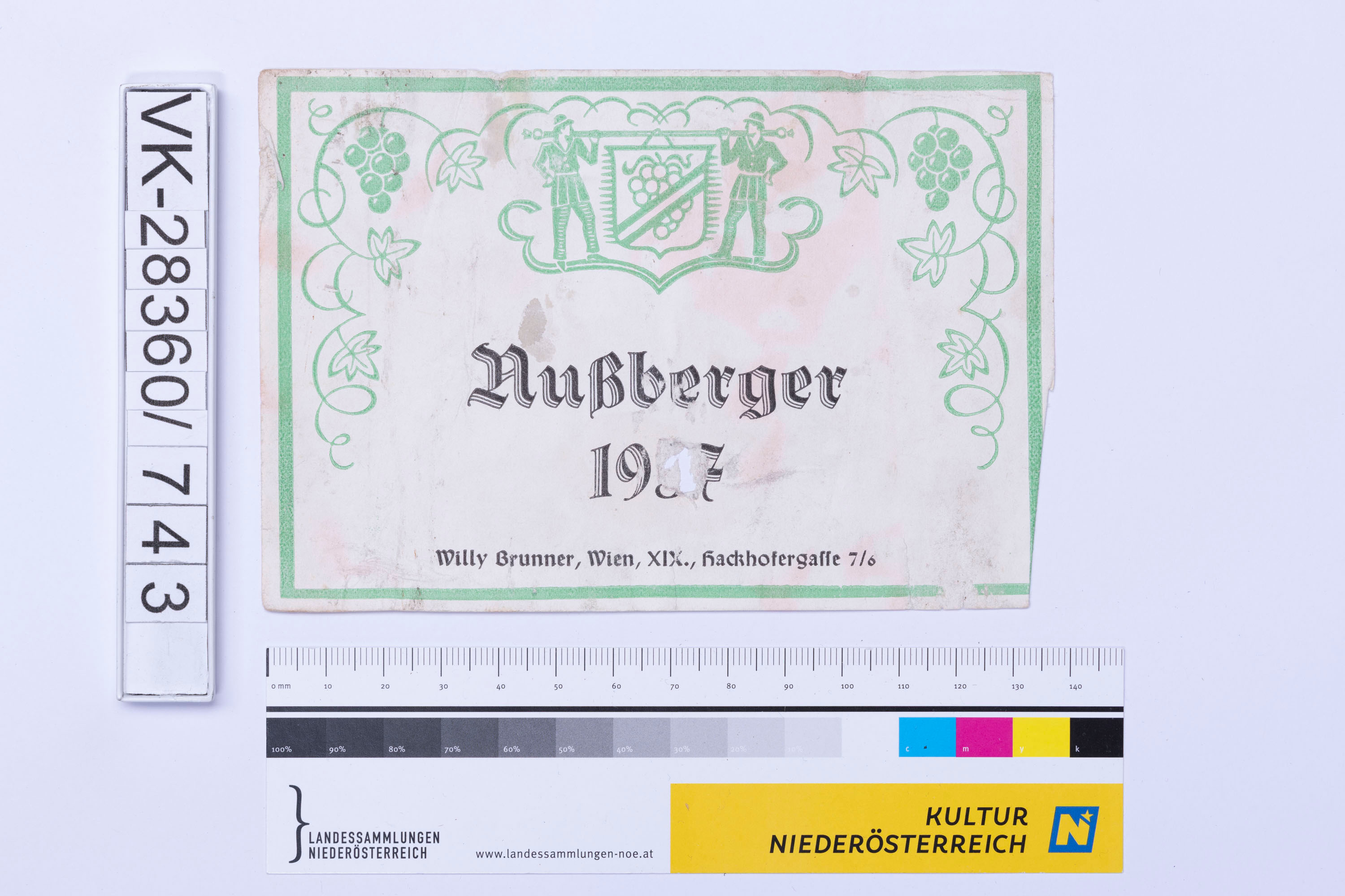 Abgelöstes Weinflaschenetikett aus einer Sammlung von den 1940er bis zu den frühen 1960er Jahren; Weinsorte: "Nußberger 19[]7", Wappendarstellung mit Weinreben; Weinbau, Kellerei bzw. Handel: "Willy Brunner, Wien, XIX., Hackhofergasse 7/6"