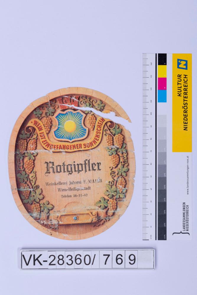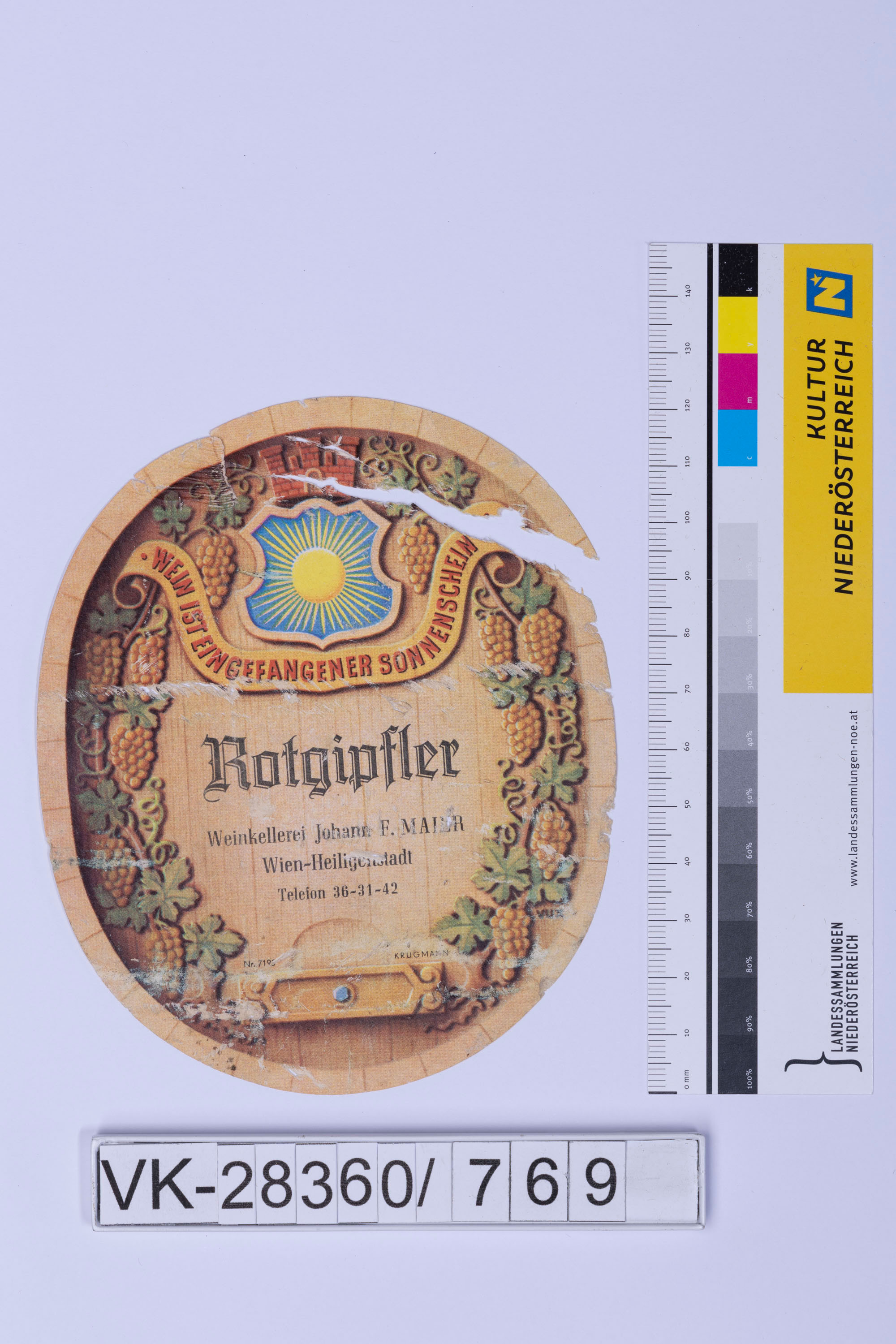 Abgelöstes Weinflaschenetikett aus einer Sammlung von den 1940er bis zu den frühen 1960er Jahren; Weinsorte: "Rotgipfler", Wappendarstellung mit Turm, Weinreben und Spruch; Weinbau, Kellerei bzw. Handel: "Weinkellerei Johann F. MAIER Wien-Heiligenstadt Telefon 36-31-42"