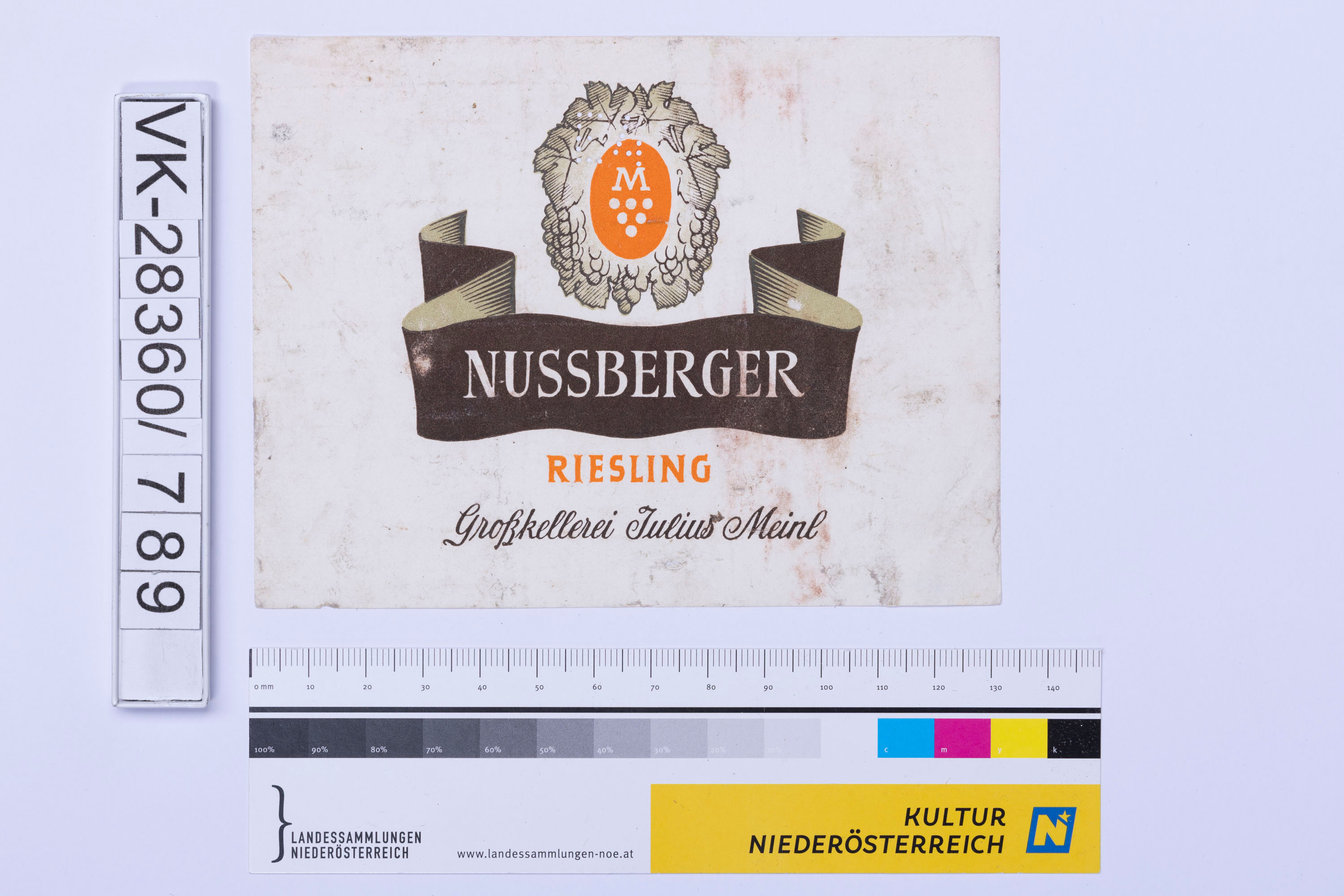 Abgelöstes Weinflaschenetikett aus einer Sammlung von den 1940er bis zu den frühen 1960er Jahren; Weinsorte: "NUSSBERGER RIESLING", Markenzeichen; "Großkellerei Julius Meinl"