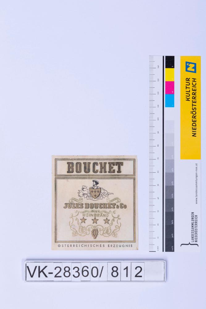 Abgelöstes Weinflaschenetikett aus einer Sammlung von den 1940er bis zu den frühen 1960er Jahren; Weinsorte: "WIEN WEINBRAND", Markenzeichen und Weinreben; Weinbau, Kellerei bzw. Handel: "JULES BOUCHET & Co"