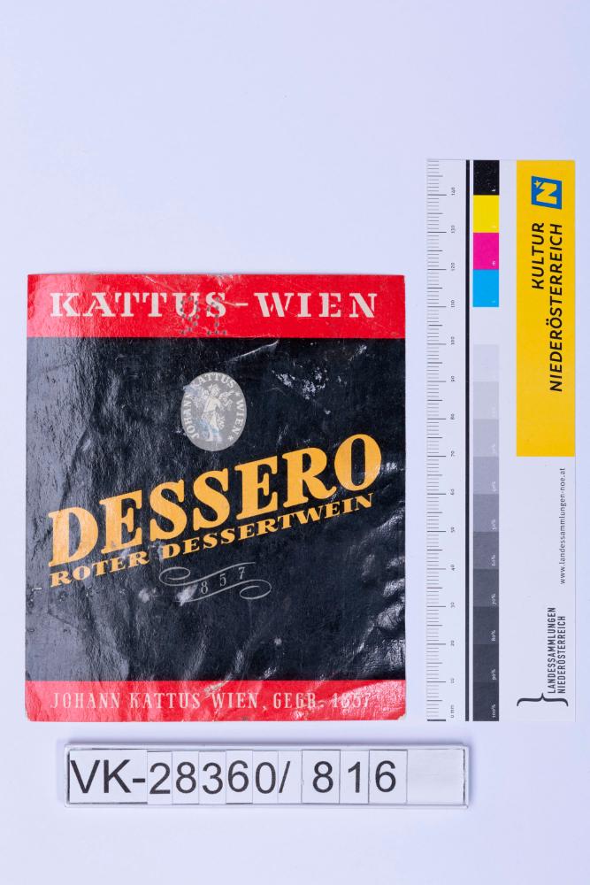 Abgelöstes Weinflaschenetikett aus einer Sammlung von den 1940er bis zu den frühen 1960er Jahren; Weinsorte. "DESSERO ROTER DESSERTWEIN", Markenzeichen; Weinbau, Kellerei bzw. Handel: "JOHANN KATTUS WIEN, GEGR. 1857"