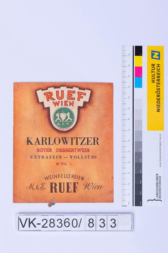 Abgelöstes Weinflaschenetikett aus einer Sammlung von den 1940er bis zu den frühen 1960er Jahren; Weinsorte: "KARLOWITZER ROTER DESSERWEIN EXTRAFEIN - VOLLSÜSS", Markenzeichen; Weinbau, Kellerei bzw. Handel: "WEINKELLEREIEN M. & E. RUEFF Wien"