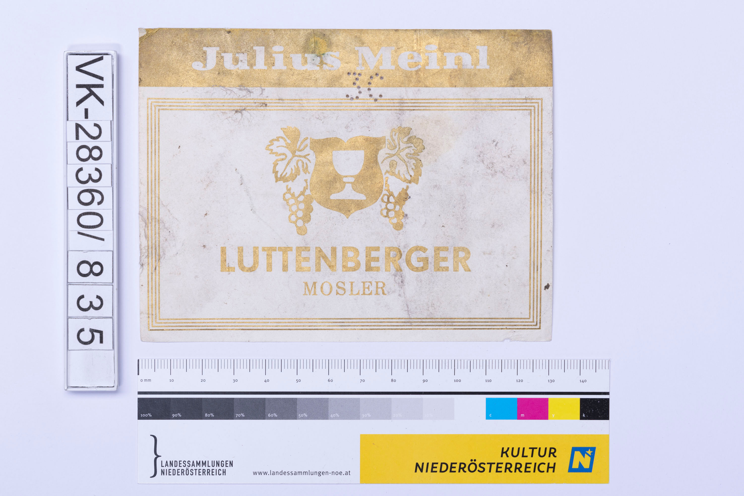 Abgelöstes Weinflaschenetikett aus einer Sammlung von den 1940er bis zu den frühen 1960er Jahren; Weinsorte: "LUTTENBERGER MOSLER", Darstellung von einem Weinglas und -reben; "Julius Meinl"