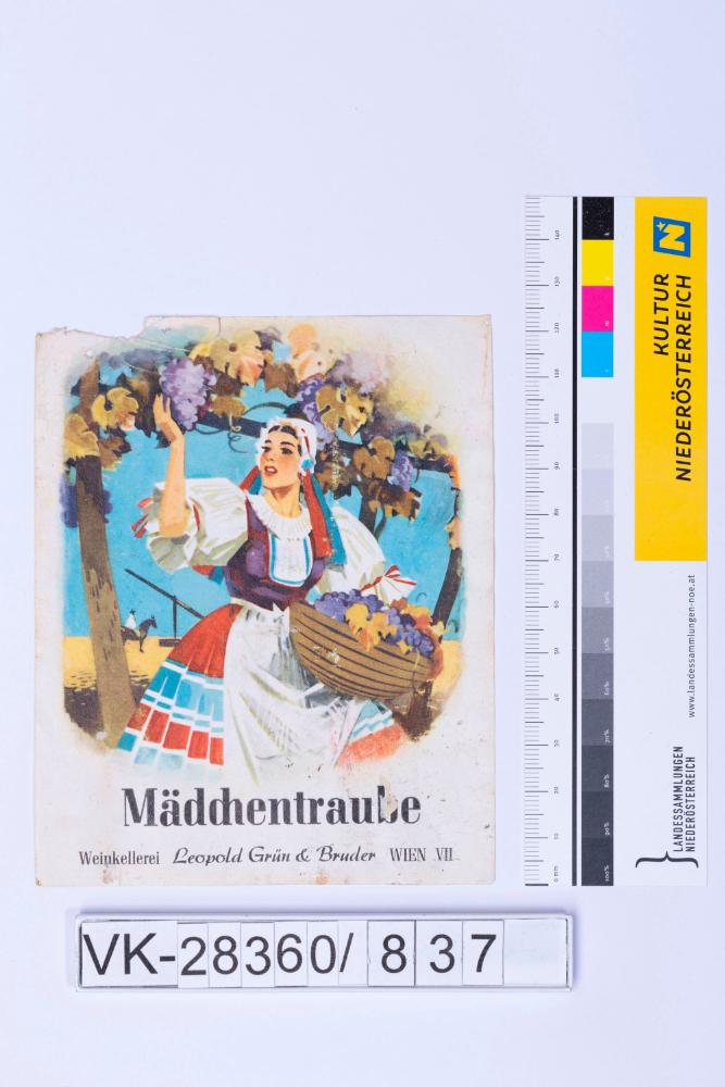 Abgelöstes Weinflaschenetikett aus einer Sammlung von den 1940er bis zu den frühen 1960er Jahren; Weinsorte: "Mädchentraube", Darstellung einer Frau bei der Weinlese; Weinbau, Kellerei bzw. Handel: "Weinkellerei Leopold Grün & Bruder WIEN VII"