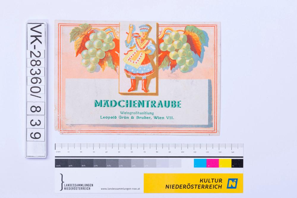 Abgelöstes Weinflaschenetikett aus einer Sammlung von den 1940er bis zu den frühen 1960er Jahren; Weinsorte: "Mädchentraube", Darstellung einer Frau bei der Weinlese; Weinbau, Kellerei bzw. Handel: "Weinkellerei Leopold Grün & Bruder WIEN VII."