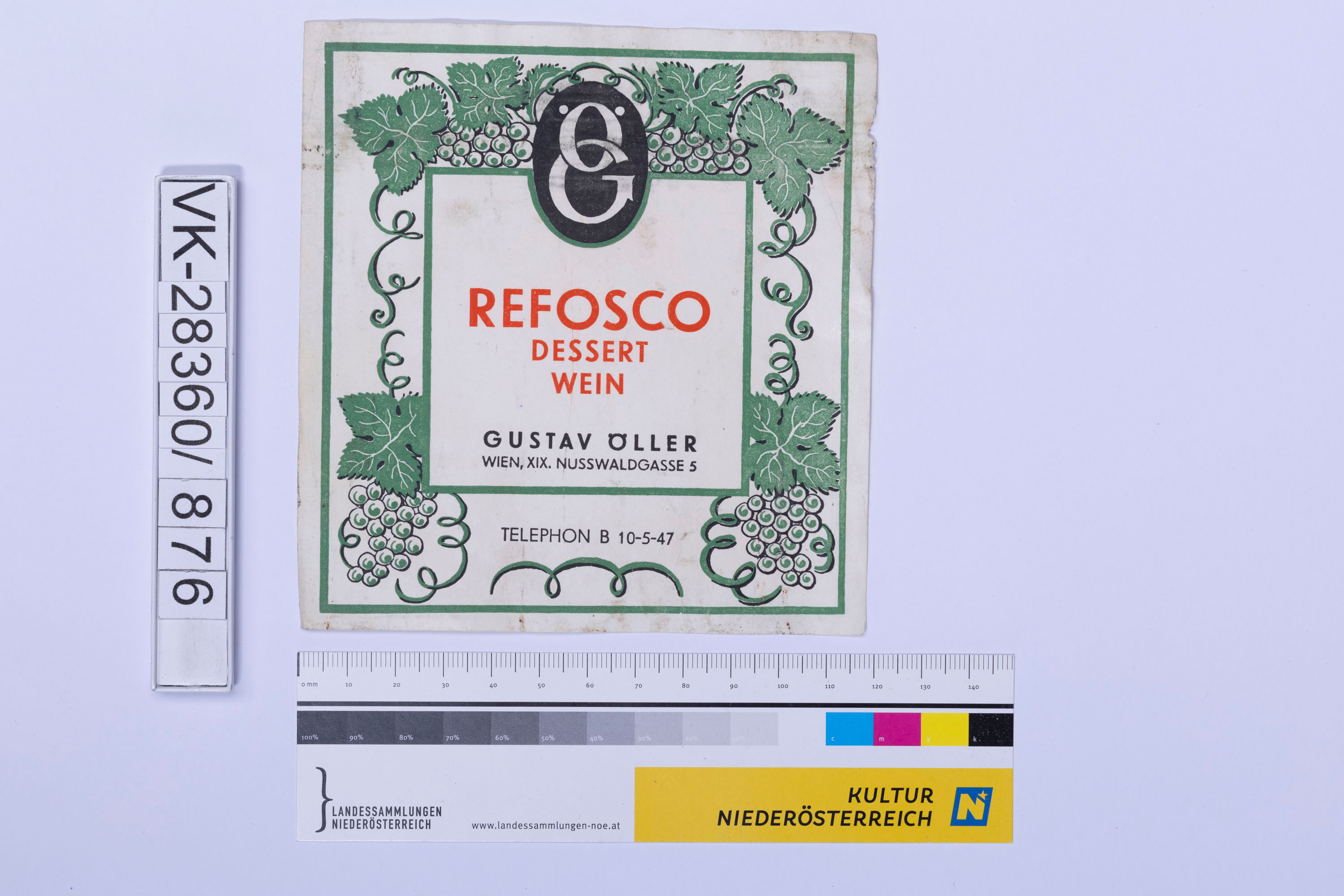 Abgelöstes Weinflaschenetikett aus einer Sammlung von den 1940er bis zu den frühen 1960er Jahren; Weinsorte: "REFOSCO DESSERT WEIN", Darstellung von Weinreben; Weinbau, Kellerei bzw. Handel: "GUSTAV ÖLLER WIEN, XIX. NUSSWALDGASSE 5 TELEPHON B 10-5-47"