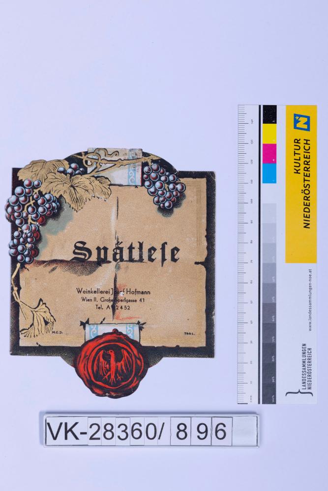Abgelöstes Weinflaschenetikett aus einer Sammlung von den 1940er bis zu den frühen 1960er Jahren; Weinsorte: "Spätlese", Darstellung von Weinreben und Siegel; Weinbau, Kellerei bzw. Handel: "Weinkellerei Josef Hofmann Wien II, Große Sperlgasse 41 Tel. A 42452"