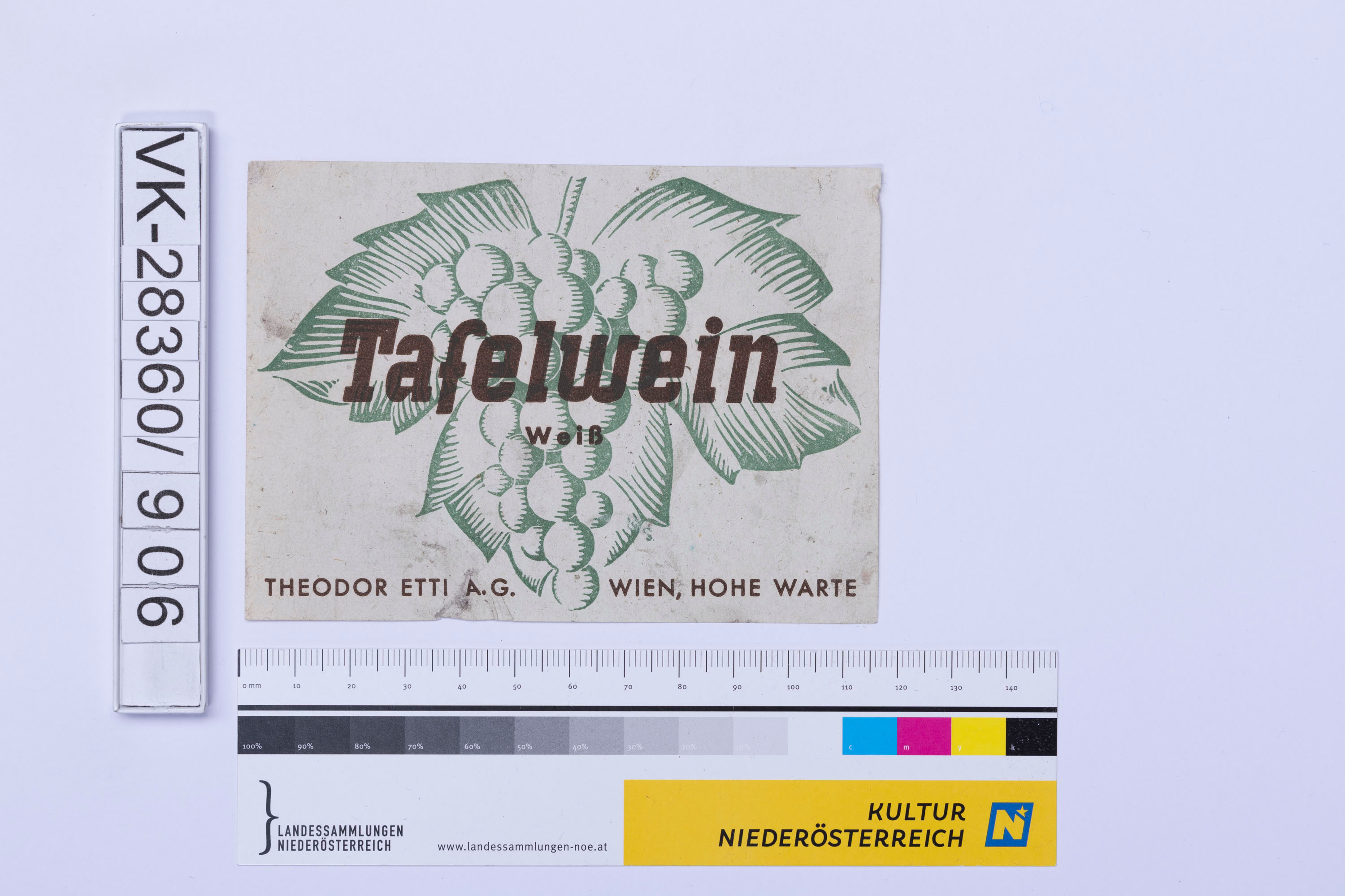 Abgelöstes Weinflaschenetikett aus einer Sammlung von den 1940er bis zu den frühen 1960er Jahren; Weinsorte: "Tafelwein Weiß", Darstellung einer Weinrebe; Weinbau, Kellerei bzw. Handel: "THEODOR ETTI A.G. WIEN, HOHE WARTE"