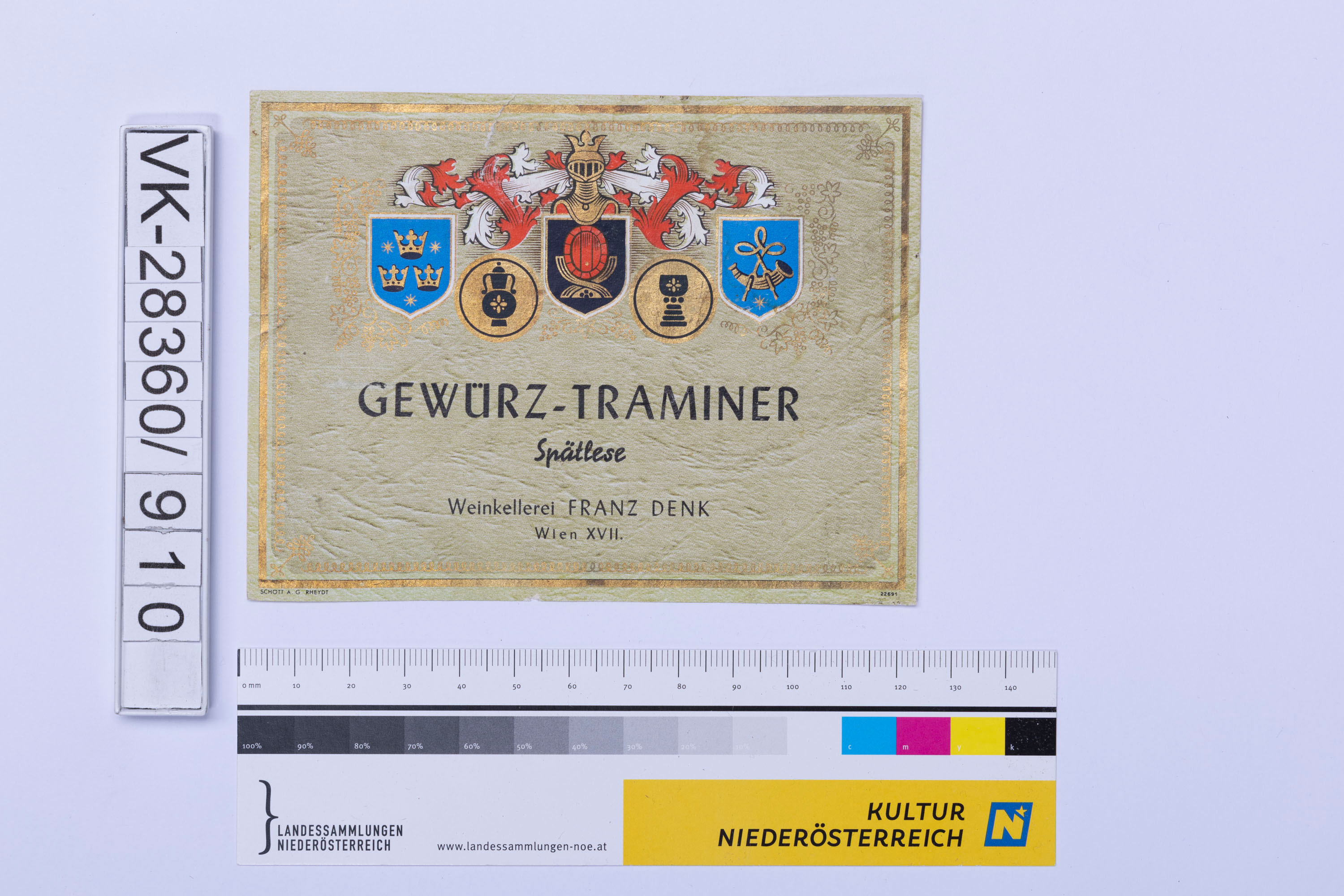Abgelöstes Weinflaschenetikett aus einer Sammlung von den 1940er bis zu den frühen 1960er Jahren; Weinsorte: "GEWÜRZ-TRAMINER Spätlese", Wappendarstellungen; Weinbau, Kellerei bzw. Handel: "Weinkellerei FRANZ DENK Wien XVII."