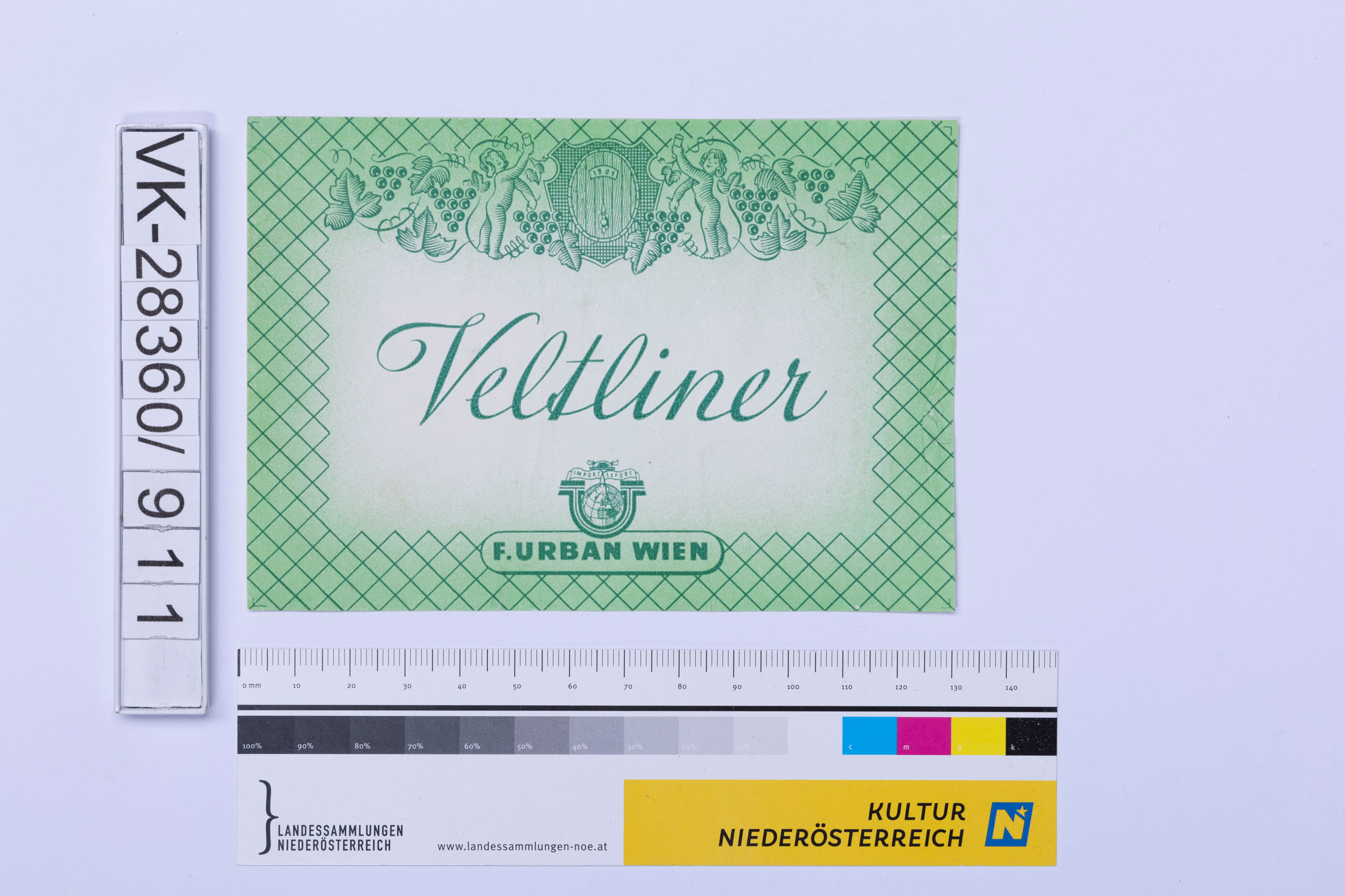 Abgelöstes Weinflaschenetikett aus einer Sammlung von den 1940er bis zu den frühen 1960er Jahren; Weinsorte: "Veltliner", Darstellung von einem Weinfass mit zwei Figuren und Weinreben; Weinbau, Kellerei bzw. Handel: "F. URBAN WIEN"