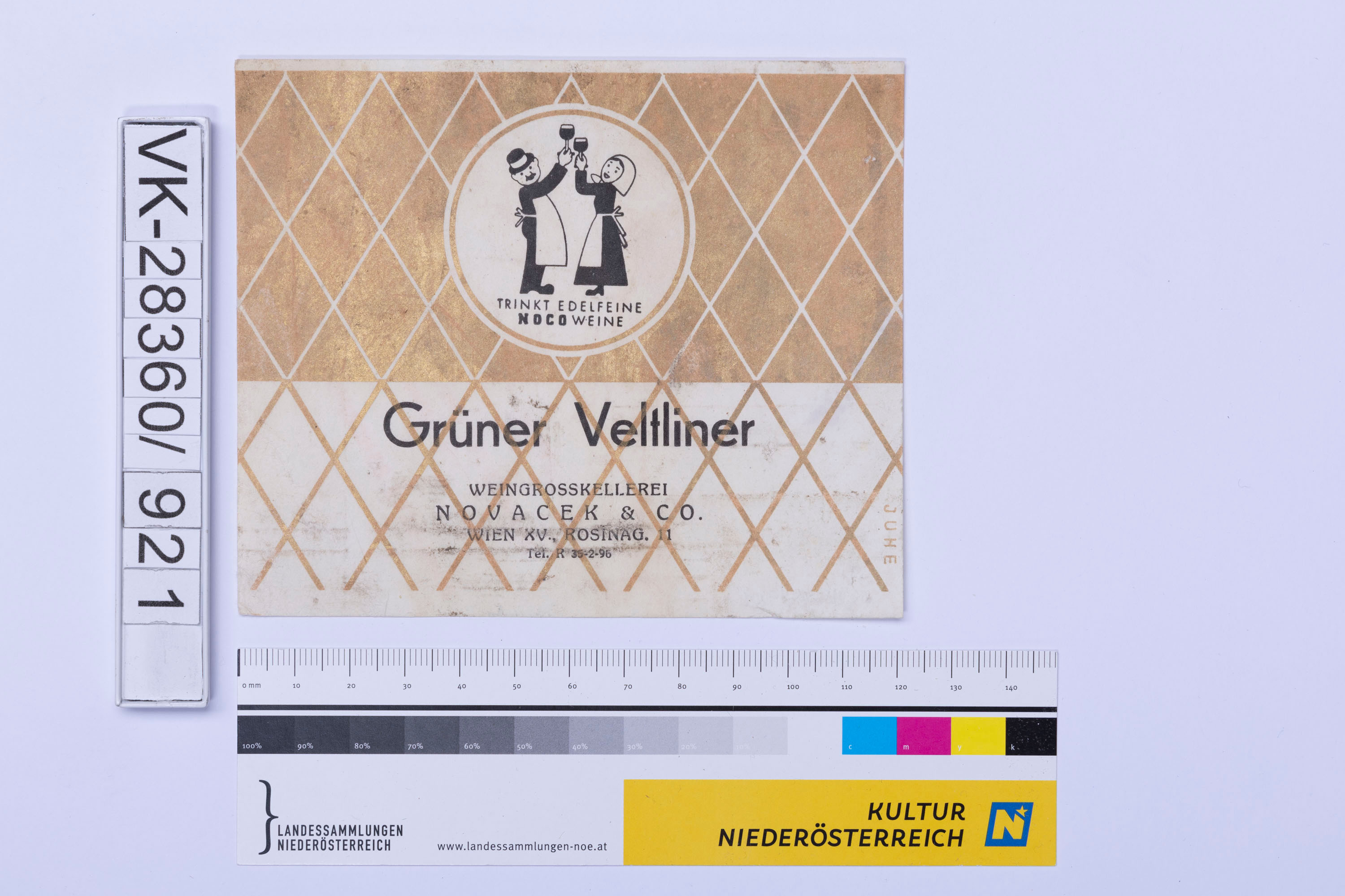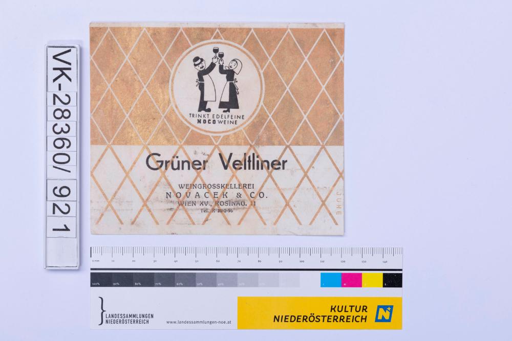 Abgelöstes Weinflaschenetikett aus einer Sammlung von den 1940er bis zu den frühen 1960er Jahren; Weinsorte: "Grün Veltliner", Darstellung eines Mannes und einer Frau mit Weingläsern, Weinbau, Kellerei bzw. Handel: " WEINGROSSKELLEREI NOVACEK & CO. Wien XV., ROSINAG. 11 Tel. R 35-2-96"