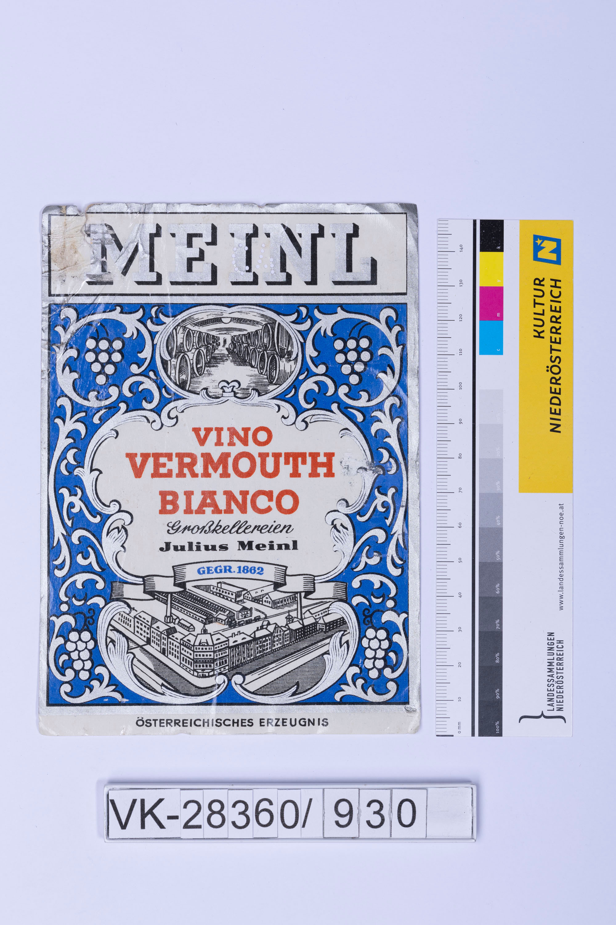 Abgelöstes Weinflaschenetikett aus einer Sammlung von den 1940er bis zu den frühen 1960er Jahren; Weinsorte: "VINO VERMOUTH BIANCO", Darstellung eines Betriebes mit Weinfässern; "Großkellereien Julius Meinl"