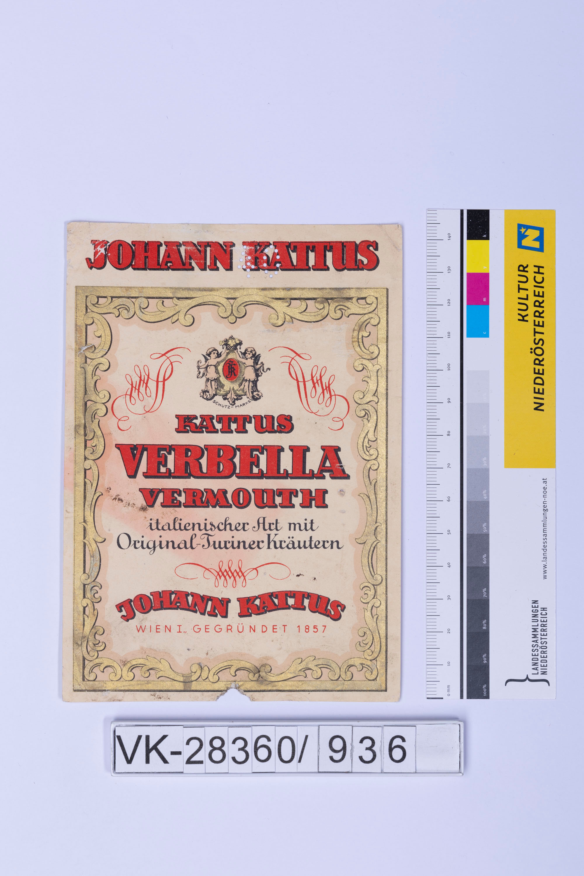 Abgelöstes Weinflaschenetikett aus einer Sammlung von den 1940er bis zu den frühen 1960er Jahren; Weinsorte: "KATTUS VERBELLA VERMOUTH", Beschriftung "italienischer Art mit Original Turiner Kräutern", Schutzmarke; Weinbau, Kellerei bzw. Handel: "JOHANN KATTUS WIEN I., GEGRÜNDET 1857"