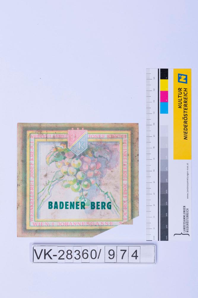 Abgelöstes Weinflaschenetikett aus einer Sammlung von den 1940er bis zu den frühen 1960er Jahren; Weinsorte: "BADENER BERG"; Darstellung Weinreben; Weinbau, Kellerei bzw. Handel: WEINKELLEREI JOSEF KREJCI WIEN, I JOHANNESGASSE 21"
