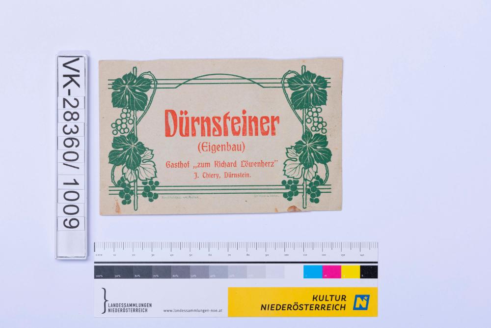 Abgelöstes Weinflaschenetikett aus einer Sammlung von den 1940er bis zu den frühen 1960er Jahren; Weinsorte: "Dürnsteiner", Darstellung von Weinreben; Weinbau, Kellerei bzw. Handel: "Gasthof "zum Richard Löwenherz" J. Thiery, Dürnstein"