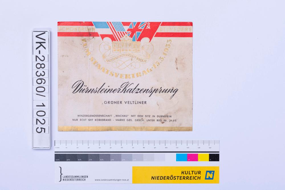 Abgelöstes Weinflaschenetikett aus einer Sammlung von den 1940er bis zu den frühen 1960er Jahren; Weinsorte: "Dürnsteiner Katzensprung GRÜNER VELTLINER", Beschriftung "SCHÖNBRUNN BELVEDERE ZUM STAATSVERTRAG 15.5.1955" Markenzeichen; Weinbau, Kellerei bzw. Handel: "WINZERGENOSSENSCHAFT "WACHAU" MIT DEM SITZ IN DÜRNSTEIN