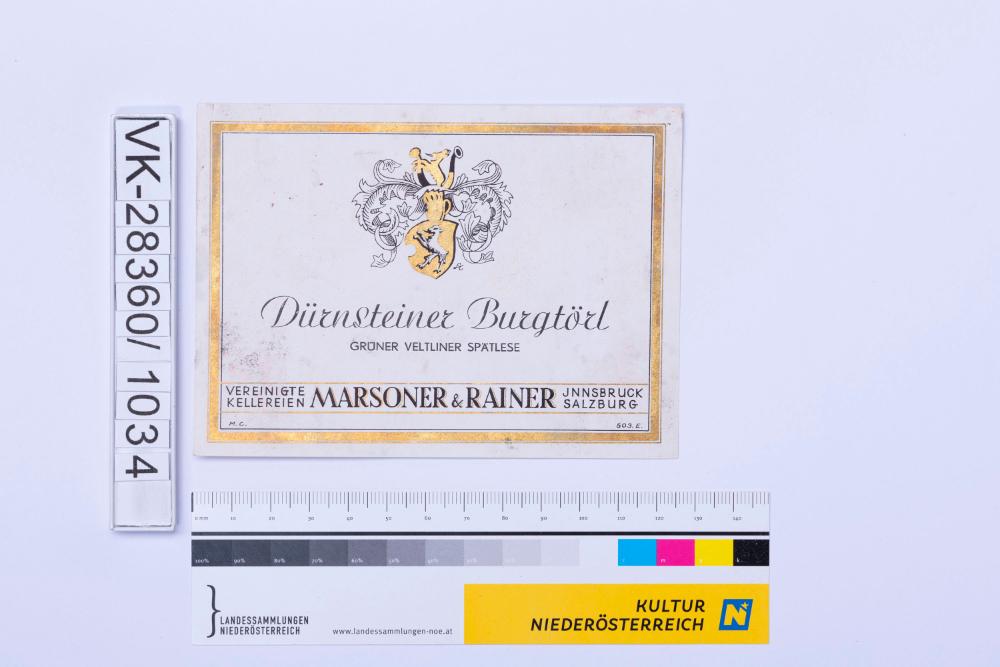 Abgelöstes Weinflaschenetikett aus einer Sammlung von den 1940er bis zu den frühen 1960er Jahren; Weinsorte: "Dürnsteiner Burgtörl GRÜNER VELTLINER", Wappendarstellung; Weinbau, Kellerei bzw. Handel: "VEREINIGTE KELLEREIEN MARSONER & RAINER INNSBRUCK SALZBURG"