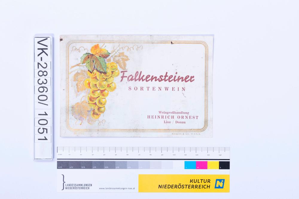 Abgelöstes Weinflaschenetikett aus einer Sammlung von den 1940er bis zu den frühen 1960er Jahren; Weinsorte: "Falkensteiner SORTENWEIN", Darstellung einer Weinrebe; Weinbau, Kellerei bzw. Handel: "Weingroßhandlung HEINRICH ORNEST Linz/Donau"