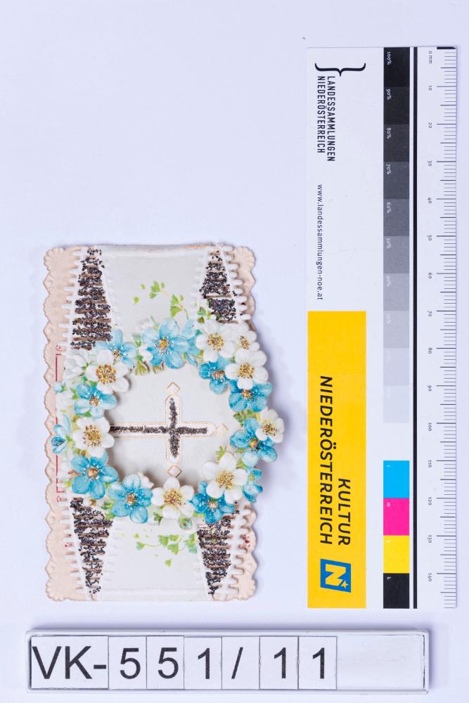 Faltkärtchen; Vorderseite: Kreuz, eingerahmt von einem Blumenkranz; Innenseite: Gnadenbild Maria Lanzendorf (Pieta), Spruch; Rückseite: Gebet
